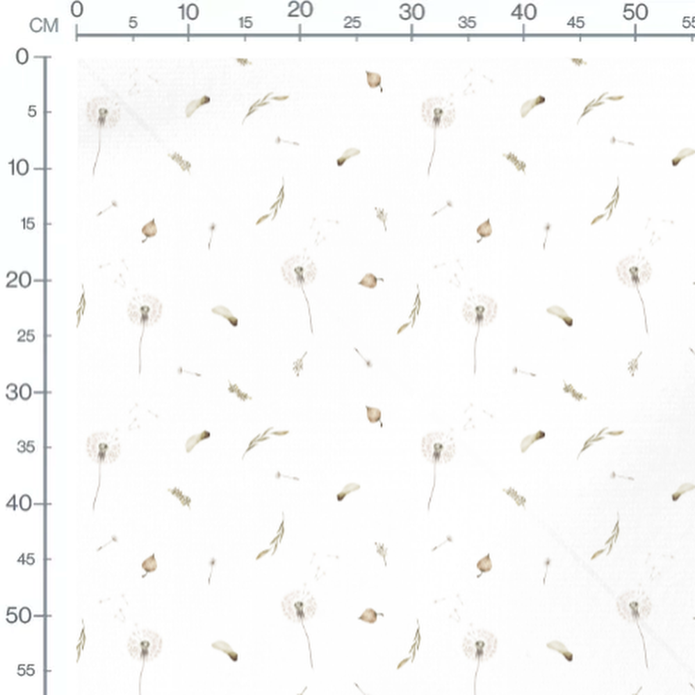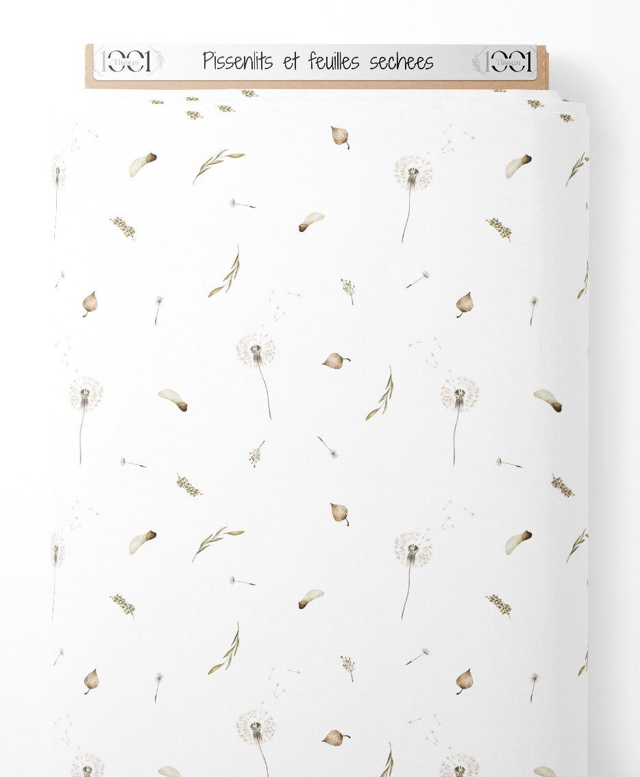 Les pissenlits sont représentés en pleine floraison avec des graines prêtes à s'envoler. Les feuilles séchées ajoutent une touche naturelle et automnale. Les brindilles fines et les petites graines complètent le motif délicat.Les tissus