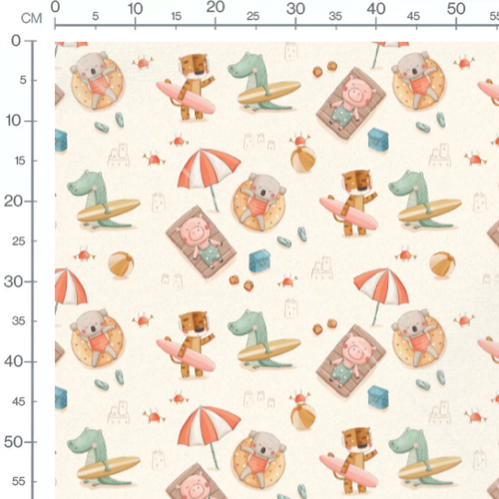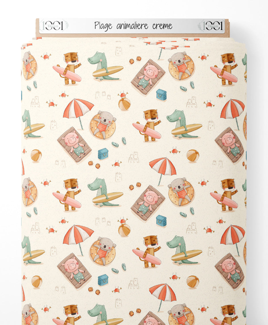 Les animaux portent des maillots et tiennent des planches de surf. Des crabes rouges et des seaux bleus complètent le décor. Les châteaux de sable sont dessinés en arrière-plan.Les tissus