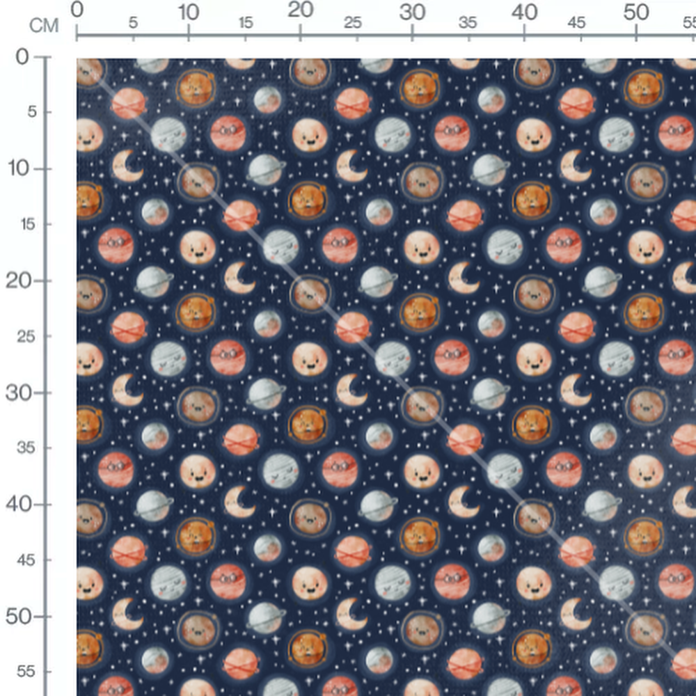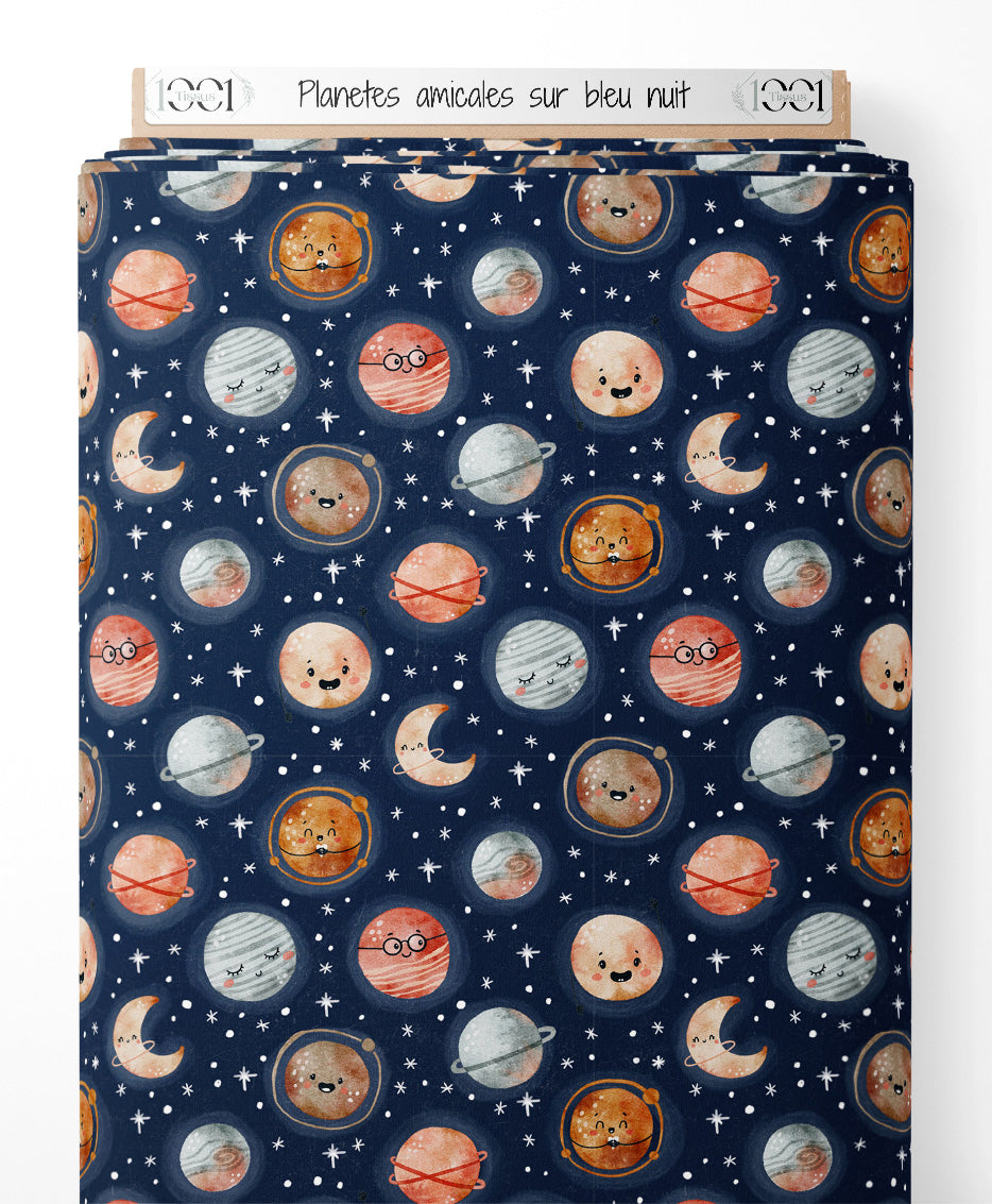 Les planètes arborent des expressions joyeuses et sont entourées de petites étoiles. La lune présente un visage souriant et amical. Le fond bleu nuit met en valeur les éléments célestes.Les tissus