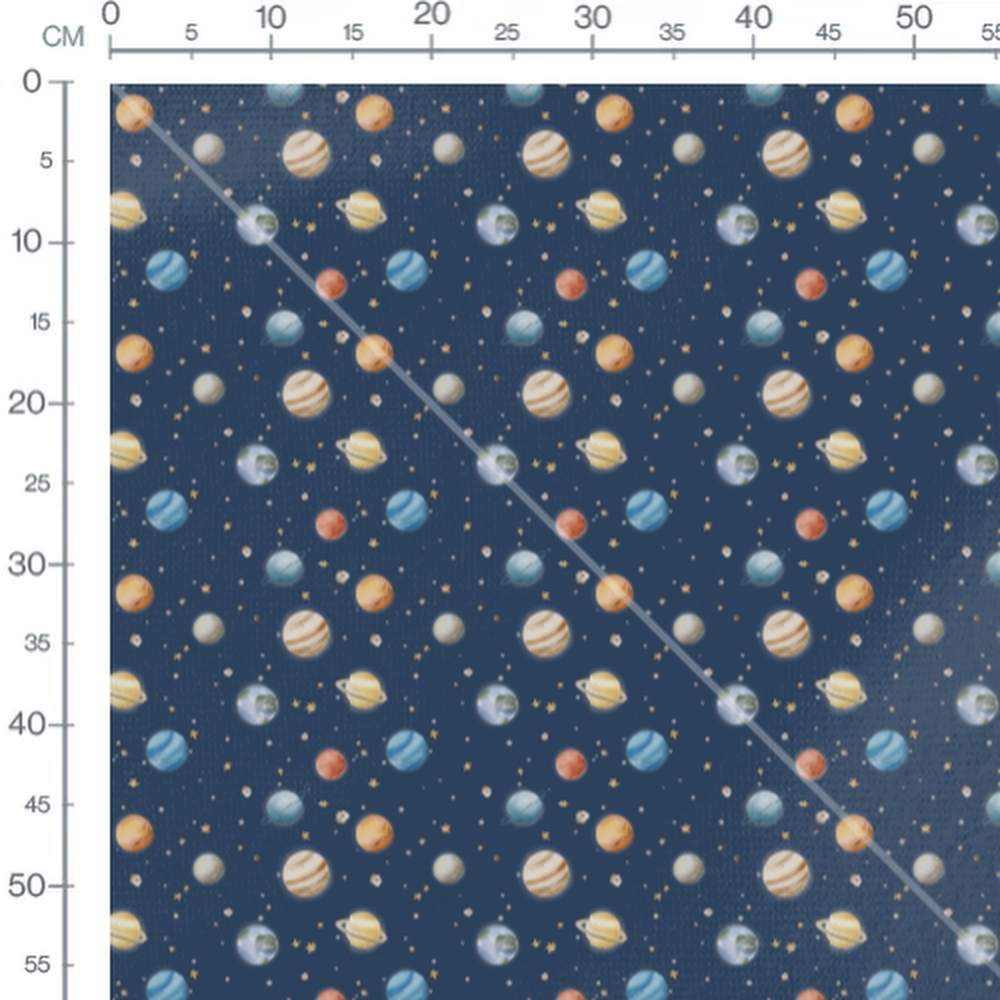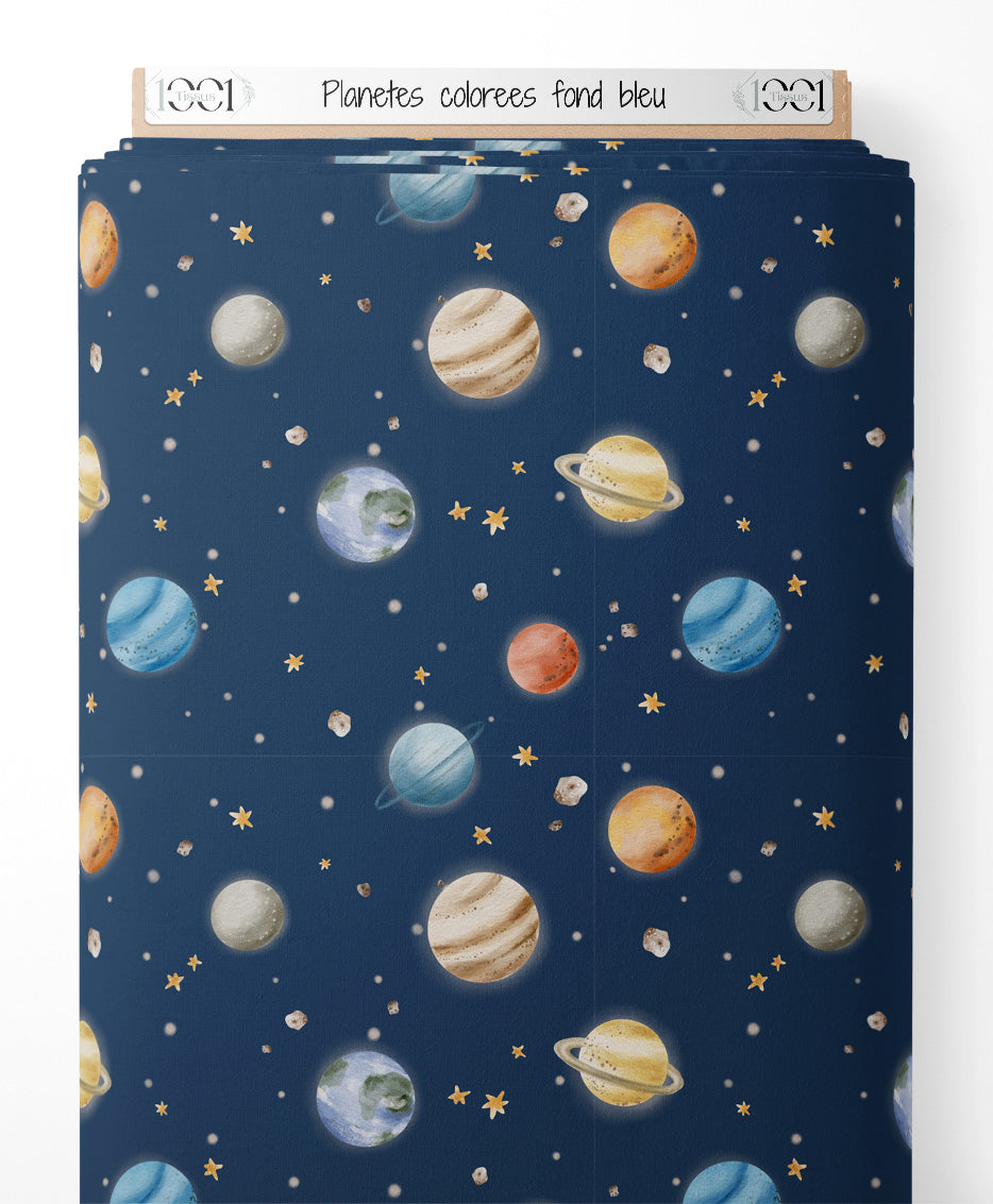 Les planètes présentent des teintes variées comme le bleu, le jaune et le rouge. Des étoiles jaunes et des astéroïdes gris complètent le motif spatial.Les tissus