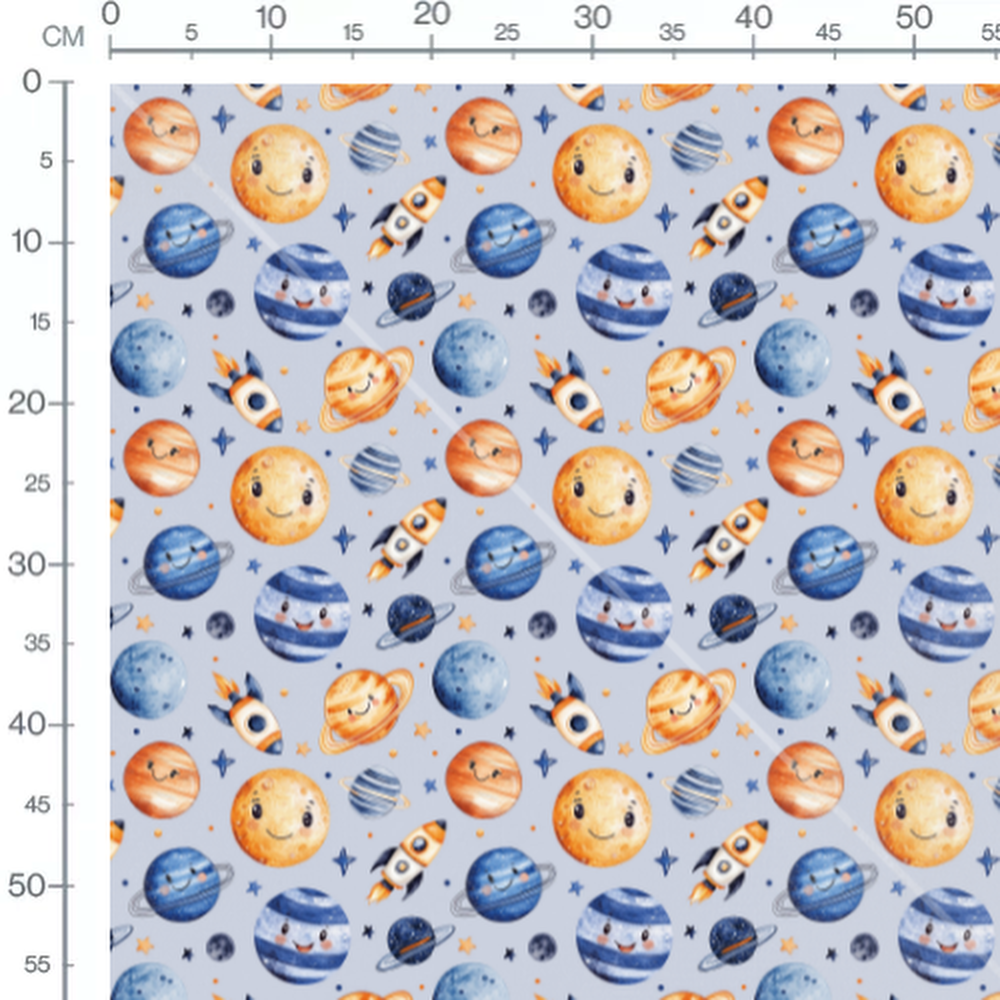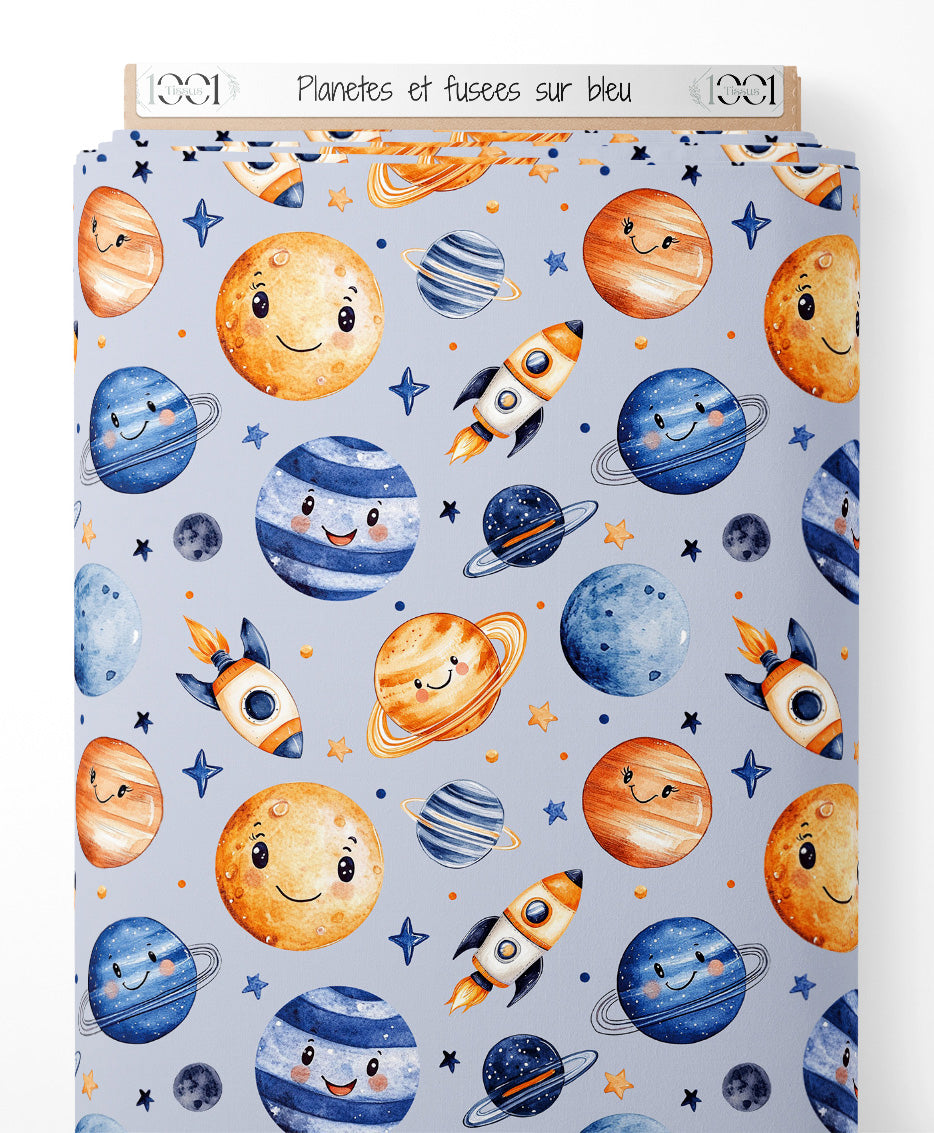 Les planètes arborent des expressions joyeuses avec des détails en bleu, orange et gris. Les fusées sont illustrées avec des flammes orange vives. De petites étoiles et planètes complètent le motif avec des teintes variées.Les tissus