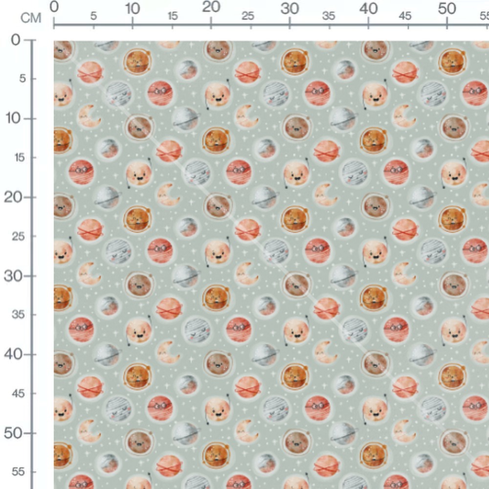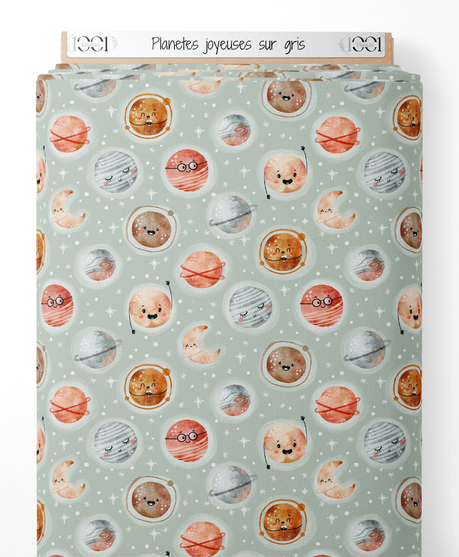 Certaines planètes portent des lunettes ou des casques d'astronaute. Les couleurs des planètes varient entre orange, gris et beige. Des croissants de lune souriants ajoutent une touche ludique.Les tissus