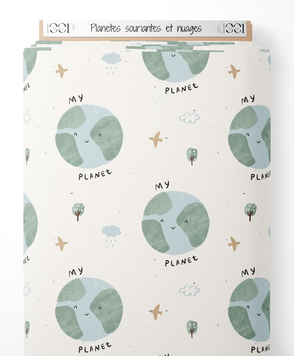 Petits arbres verts ajoutent une touche de nature. Quelques gouttes de pluie tombent d'un nuage gris. Le texte 'My Planet' accompagne chaque planète.Les tissus