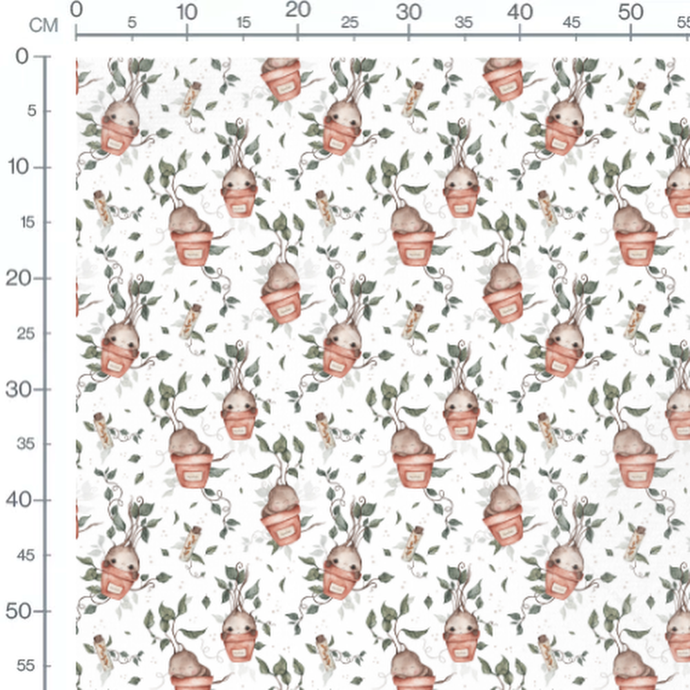 Les plantes ont des visages souriants et sont entourées de feuilles vertes. Des tubes à essai avec des motifs floraux ajoutent une touche scientifique. Le fond blanc met en valeur les éléments du motif.Les tissus