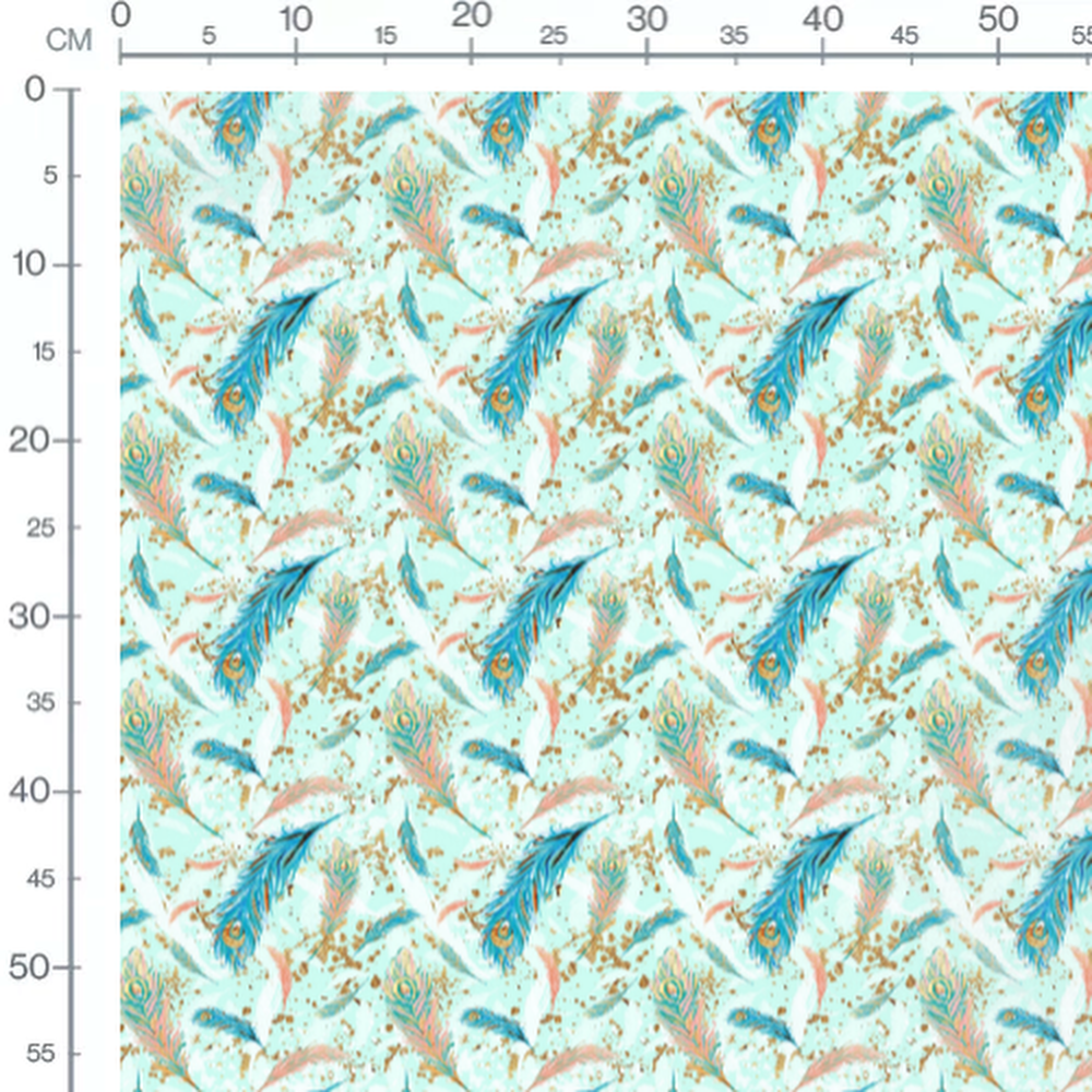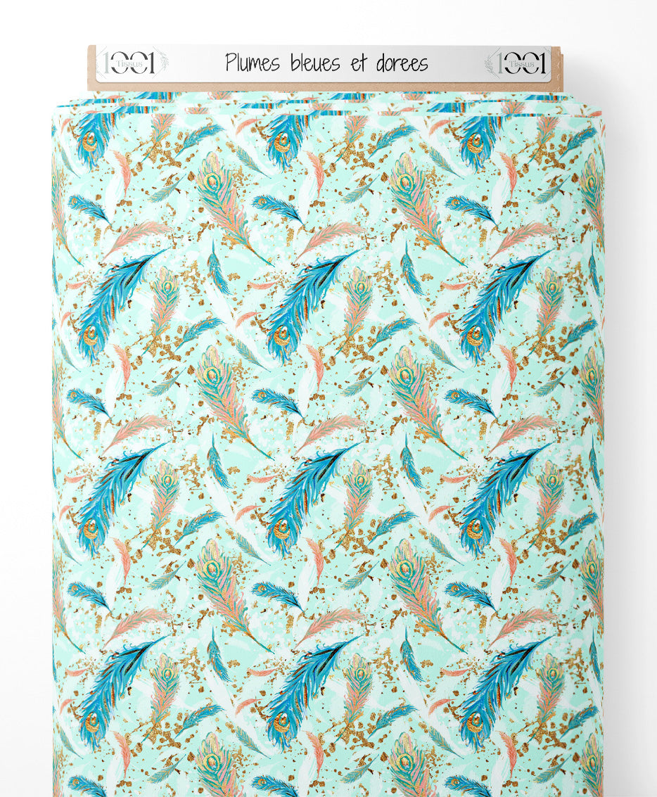 Les plumes présentent des nuances de bleu vif et de rose pâle. Des touches dorées ajoutent un éclat subtil au motif.Les tissus