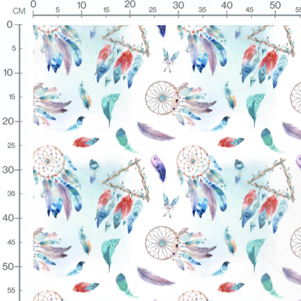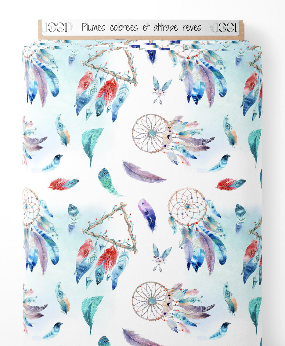 Les plumes présentent des nuances de bleu, rouge et violet. Les attrape-rêves sont ornés de cercles en bois et de perles turquoise. Quelques branches avec des baies rouges complètent le motif.Les tissus