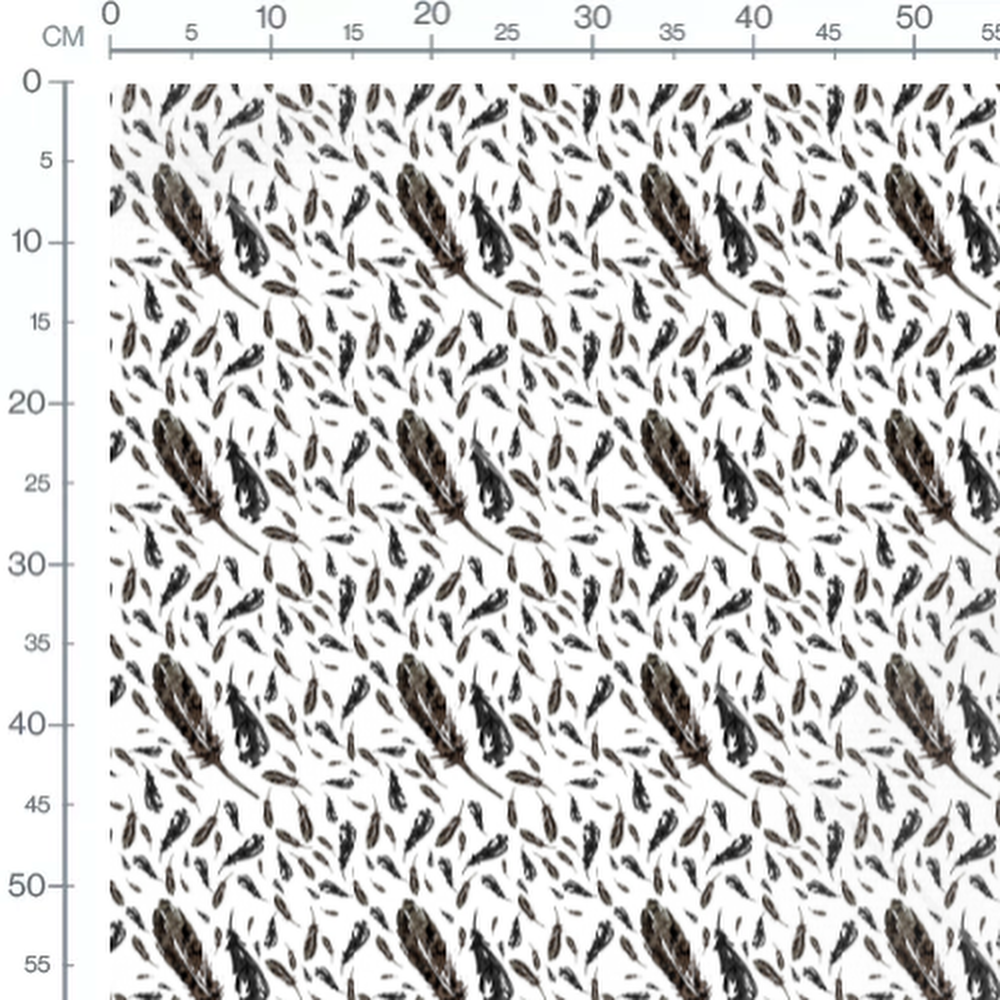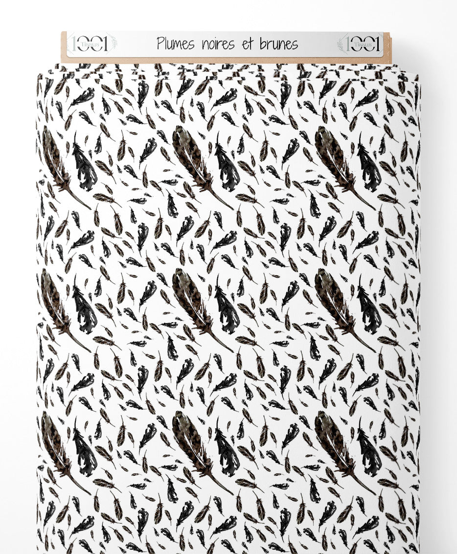 Les plumes varient en taille et en teinte, allant du noir profond au brun terreux. Le fond blanc met en valeur les détails des plumes. Chaque plume présente des nuances subtiles et des textures distinctes.Les tissus