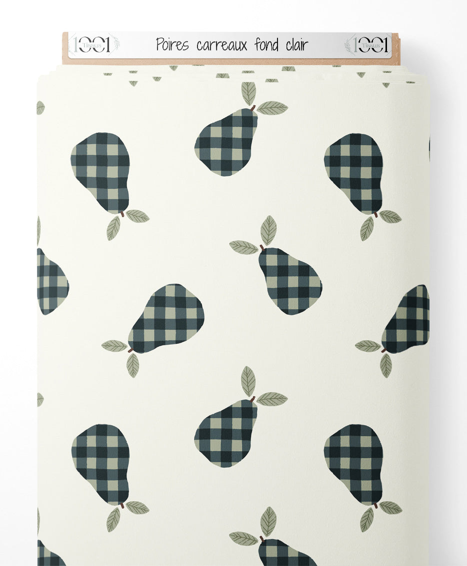 Les poires sont ornées d'un motif à carreaux noirs et gris. Chaque poire est accompagnée de petites feuilles vertes. Le fond est d'une teinte blanc cassé uniforme.Les tissus
