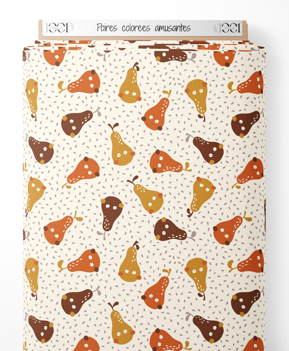 Les poires ont des yeux et des joues colorées. Les couleurs vives des poires contrastent avec le fond clair. Les petits points ajoutent une texture subtile au motif.Les tissus