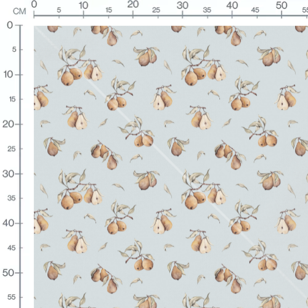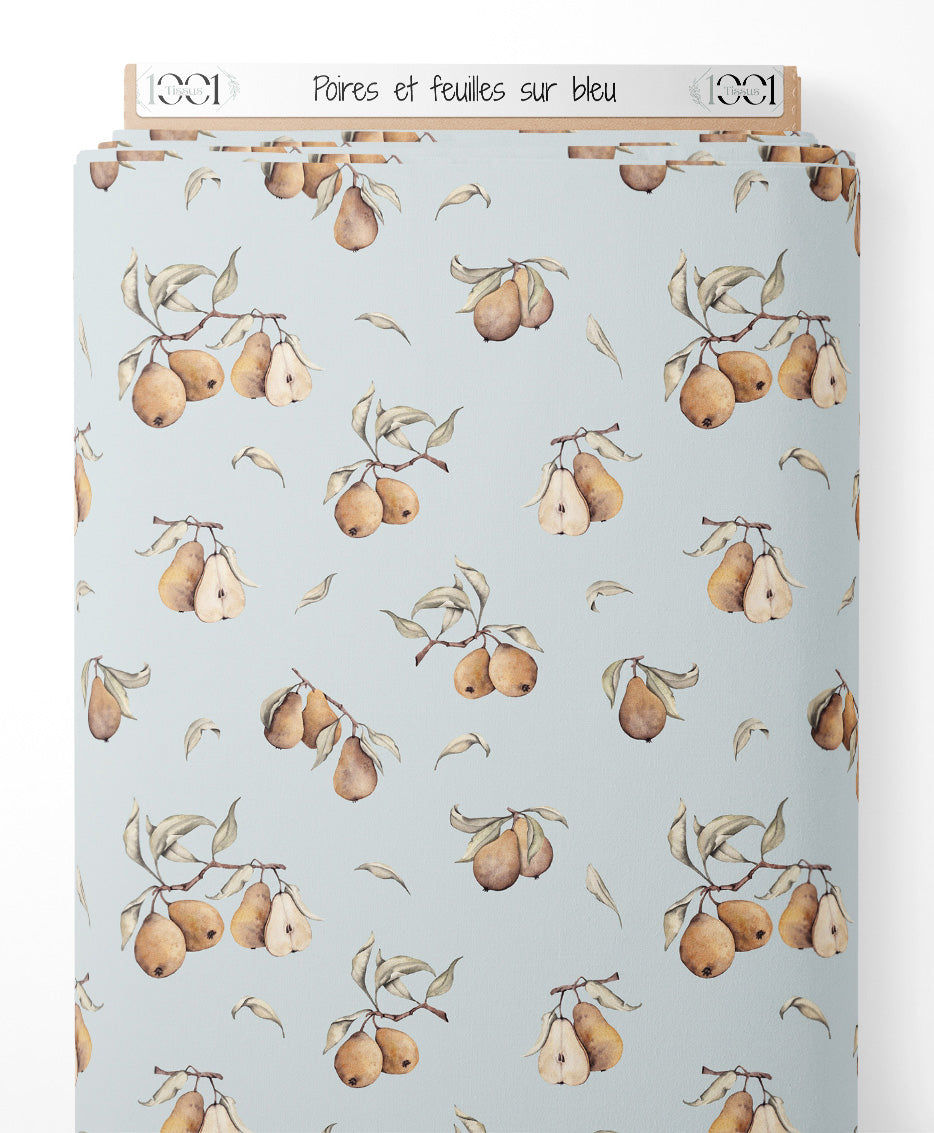 Les poires sont accompagnées de feuilles vertes et de branches marron. Le fond bleu clair met en valeur les nuances des fruits. Les feuilles sont délicatement dessinées, ajoutant une touche naturelle. Les poires varient en teintes de jaune et brun.Les tissus