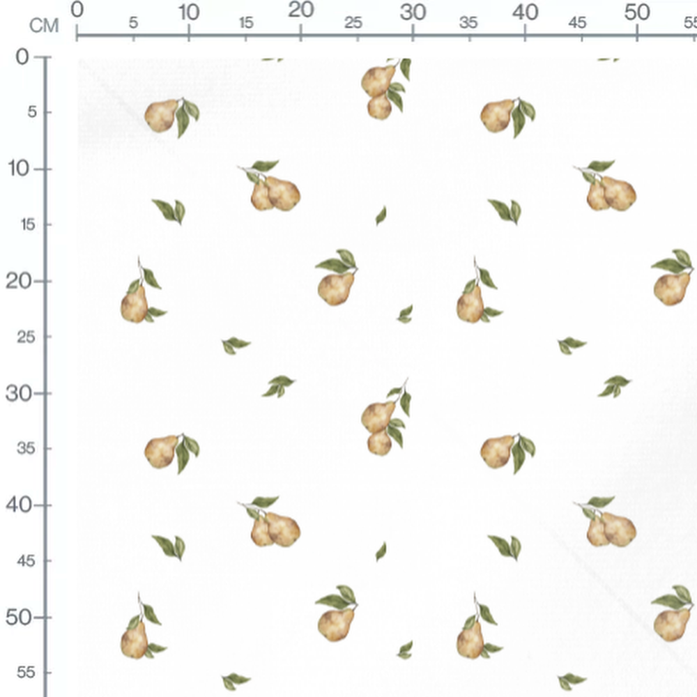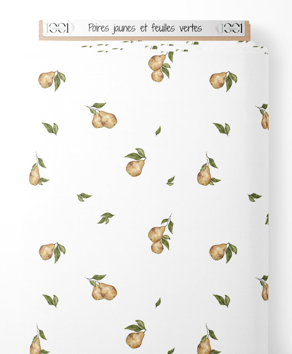 Les poires sont de couleur jaune pâle avec des nuances brunes. Les feuilles vertes sont délicatement dessinées, ajoutant une touche naturelle au motif.Les tissus