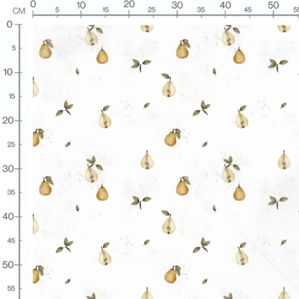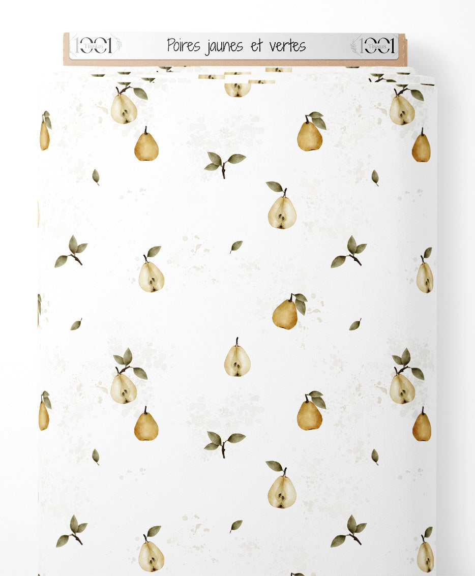 Les poires sont peintes dans des tons doux de jaune et de vert. Les feuilles ajoutent une touche de vert subtil au motif.Les tissus