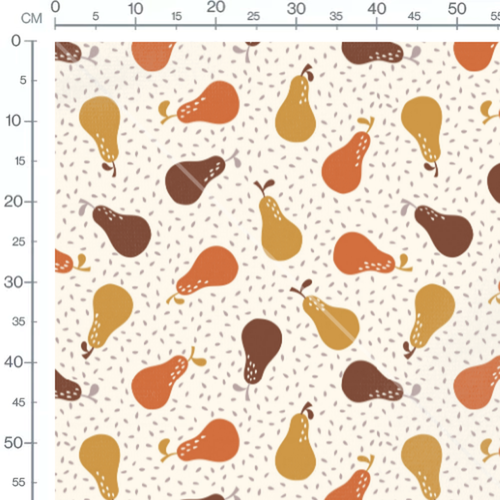 Les poires sont de différentes teintes, incluant l'orange, le marron et le jaune. Le fond crème est parsemé de petits points gris, ajoutant une texture subtile au motif.Les tissus