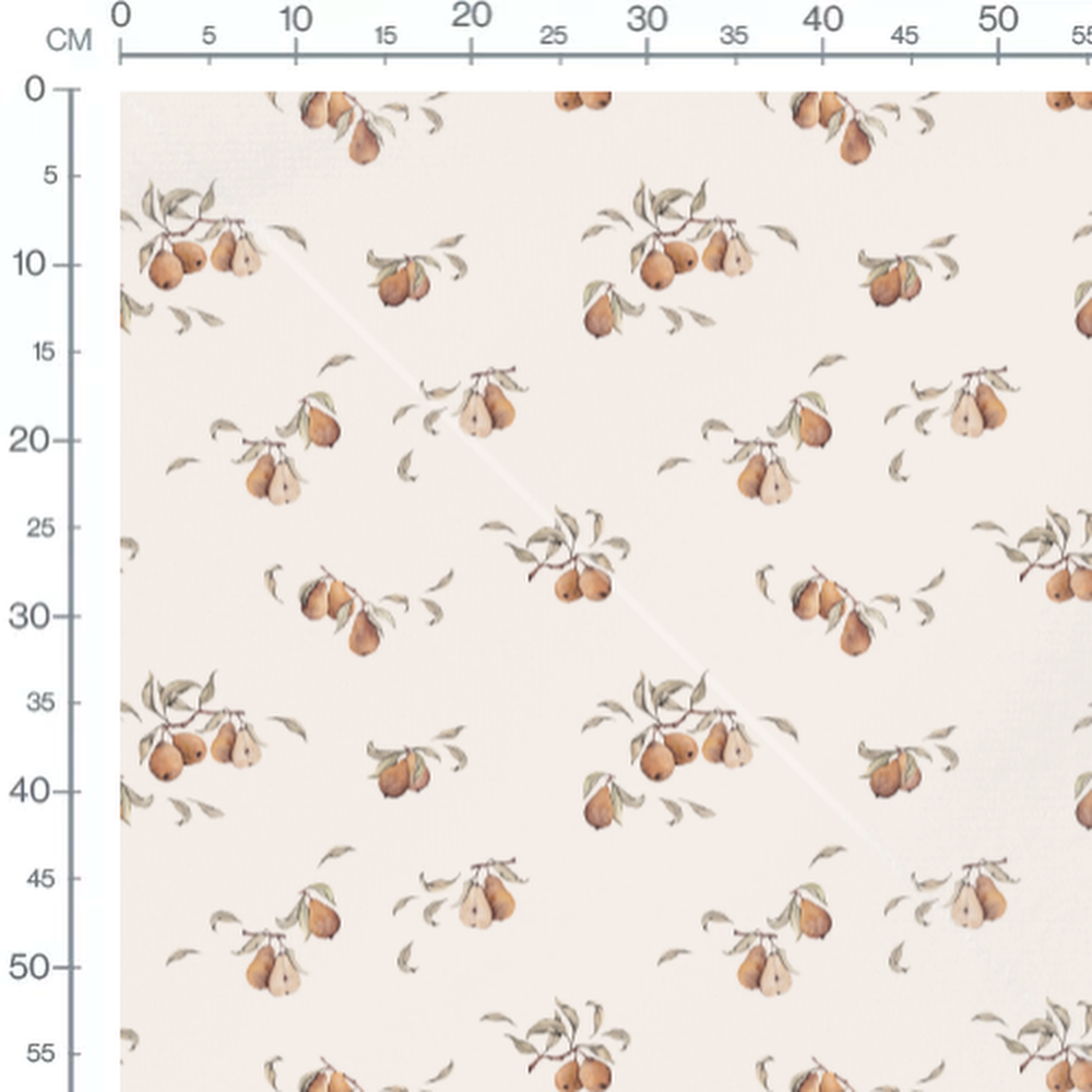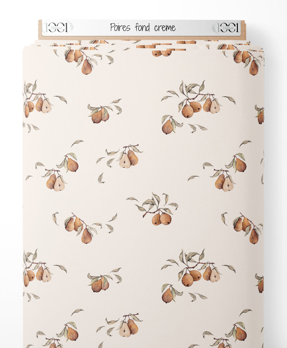 Les poires sont dessinées dans des tons marron doux. Les feuilles vertes ajoutent une touche naturelle au motif.Les tissus