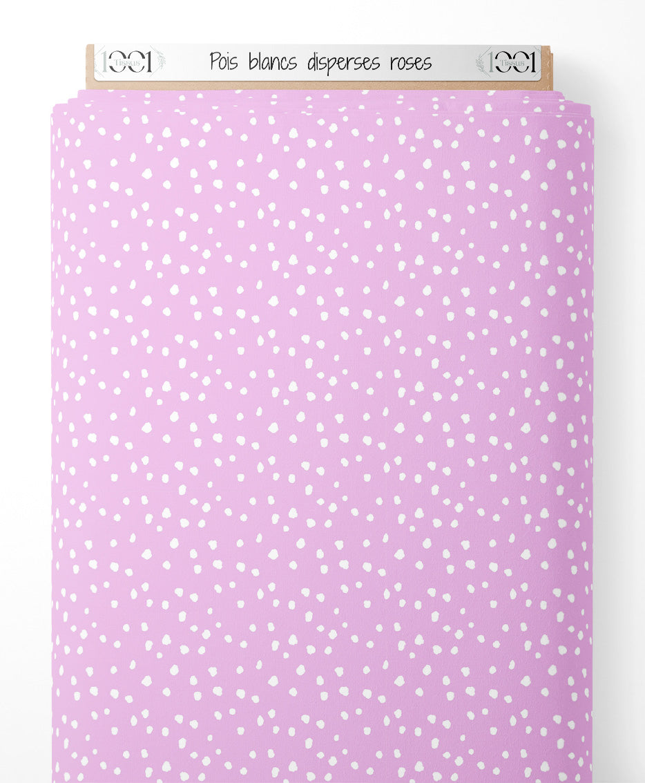 Les pois sont dispersés de manière aléatoire sur toute la surface. Le fond rose pastel crée un contraste doux avec les pois blancs.Les tissus
