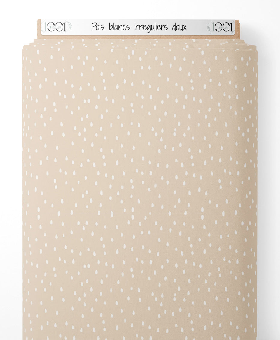 Pois blancs irréguliers sur fond beige. Motif simple et épuré.Les tissus