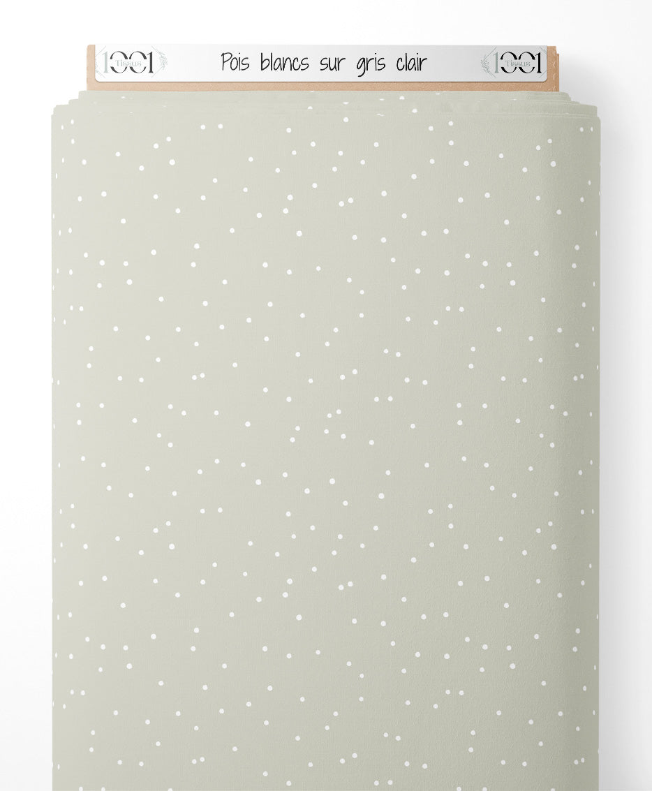 Les pois sont uniformément répartis sur le fond. Le fond gris clair met en valeur les pois blancs.Les tissus
