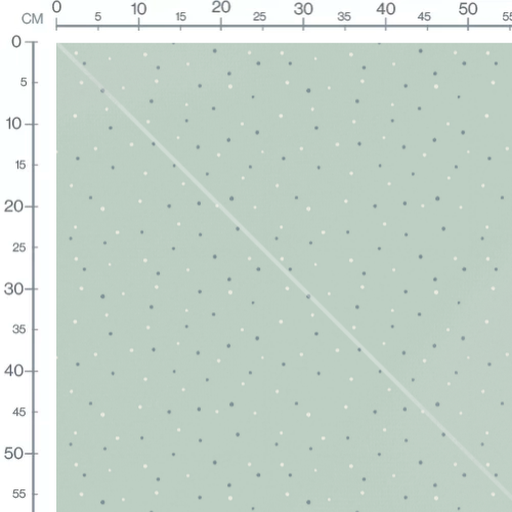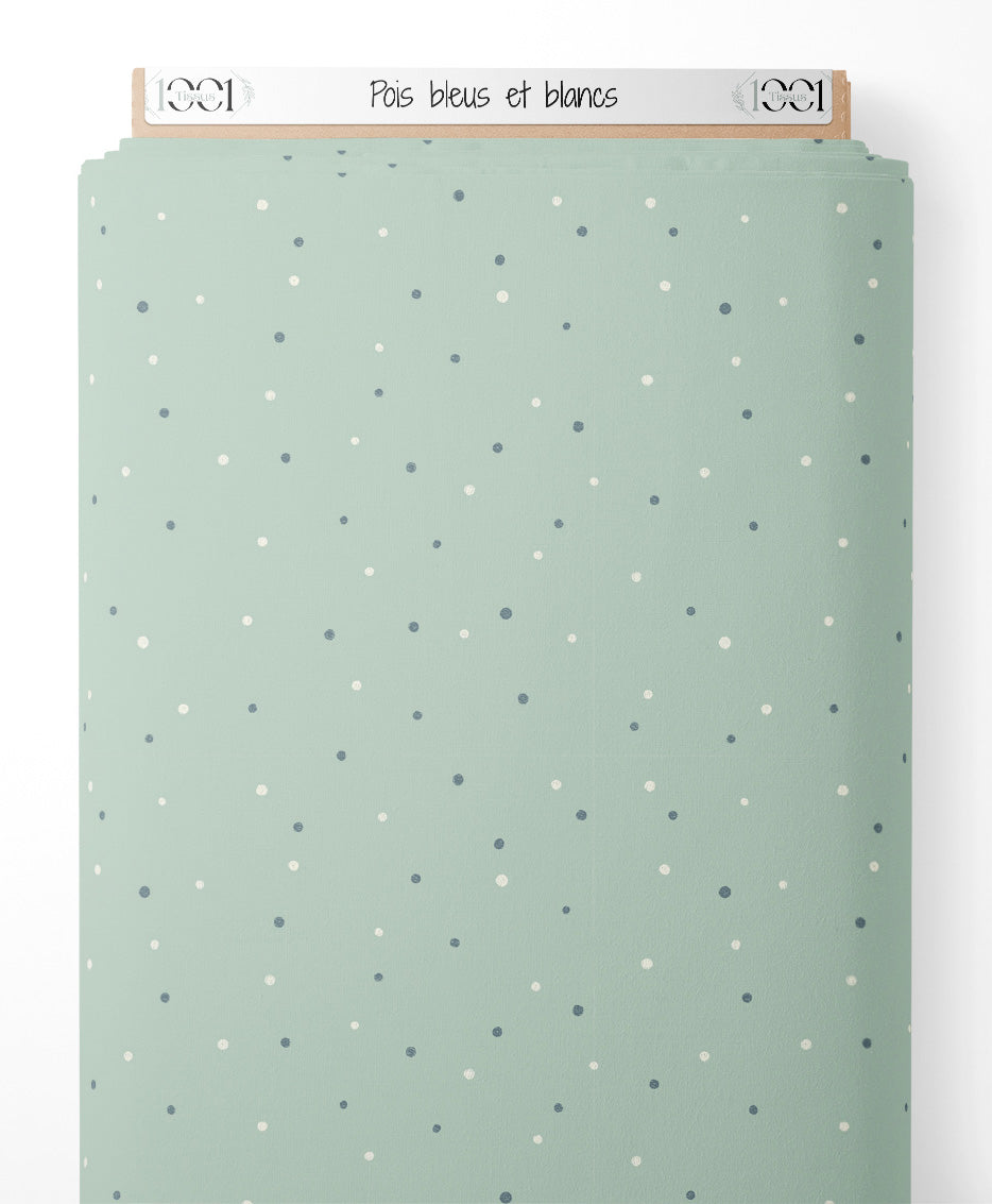 Pois bleus et blancs sur fond vert. Petits motifs réguliers et espacés.Les tissus