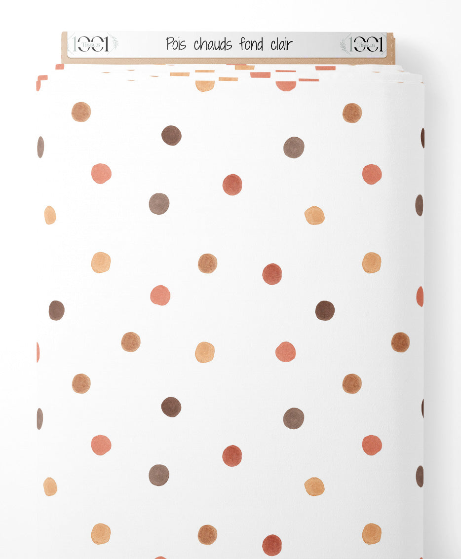 Les pois sont de tailles variées et répartis uniformément. Les couleurs des pois incluent des teintes de marron, orange et rouge.Les tissus