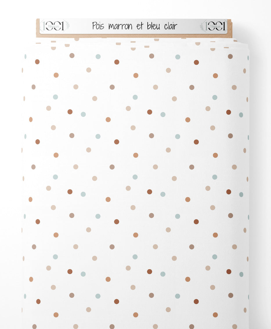 Les pois varient en teintes de marron et de bleu clair. Le fond blanc met en valeur les couleurs des pois.Les tissus
