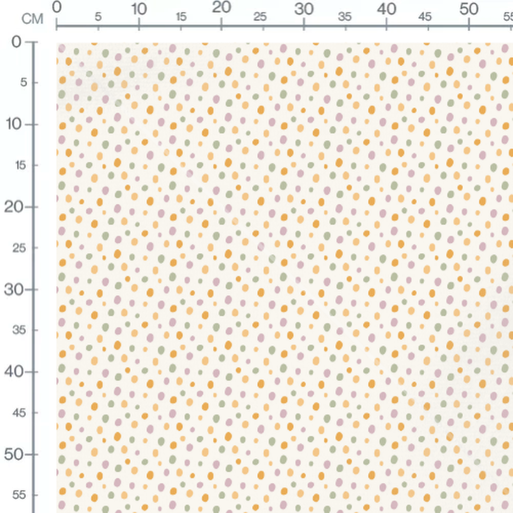 Les pois verts, orange et mauves sont répartis uniformément. Les couleurs douces créent un motif harmonieux et apaisant.Les tissus