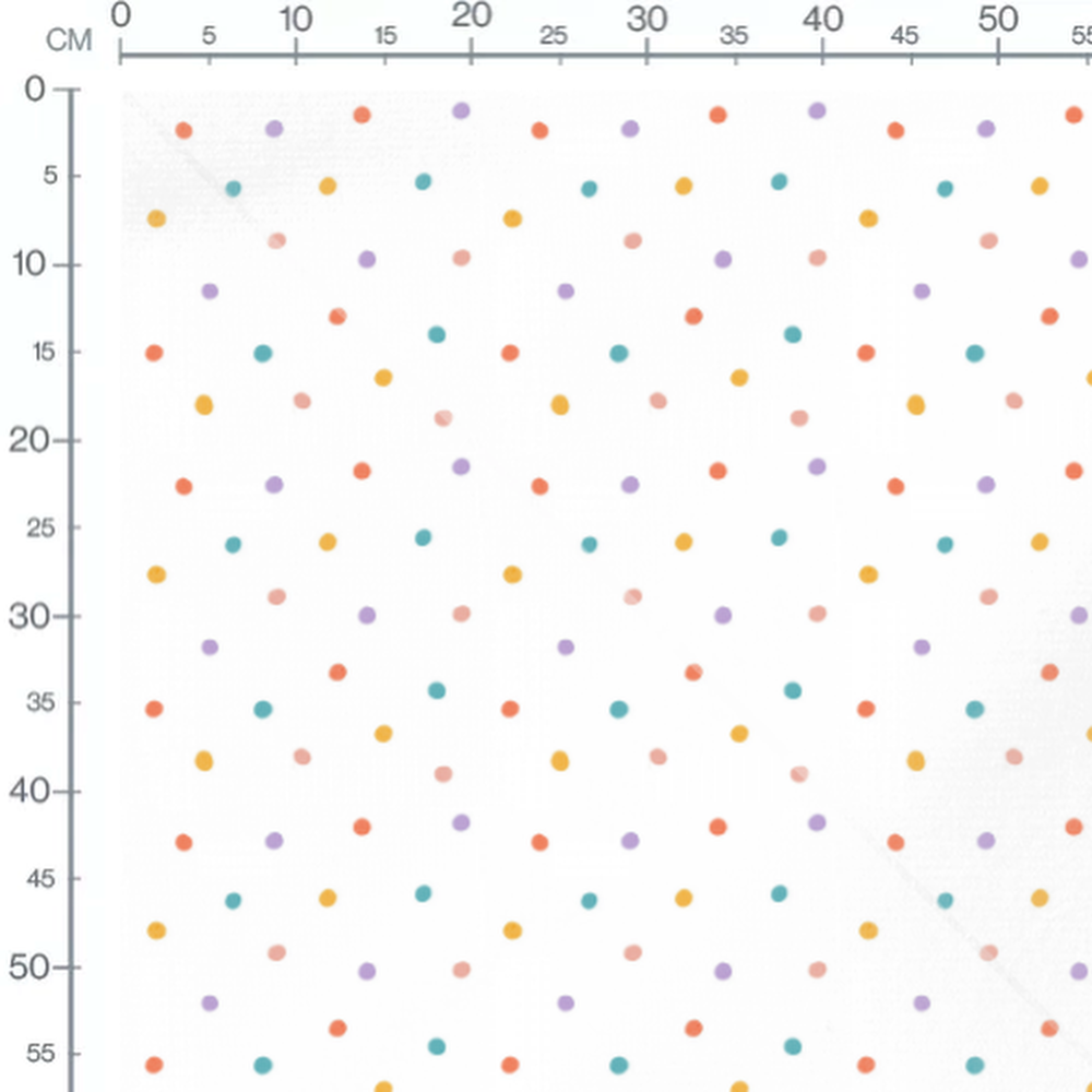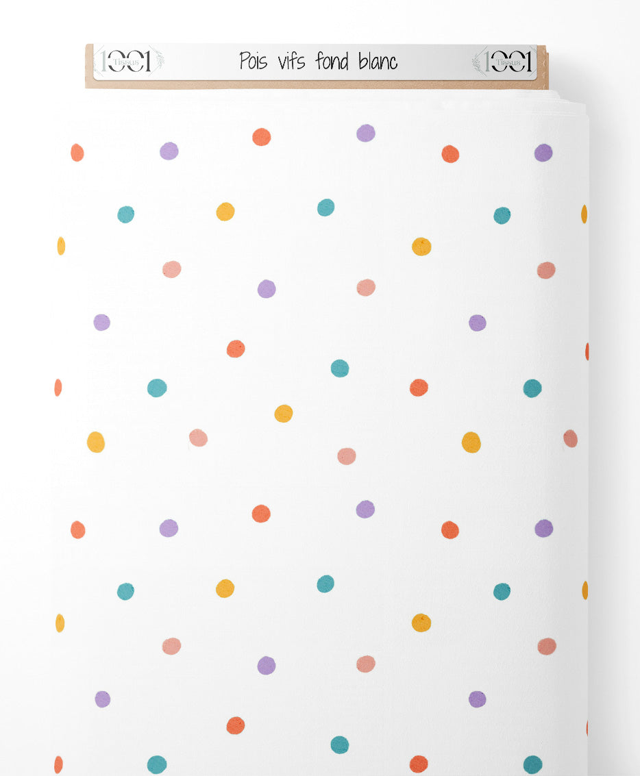 Les pois sont répartis uniformément sur le fond blanc. Chaque couleur de pois apporte une touche vive et ludique.Les tissus
