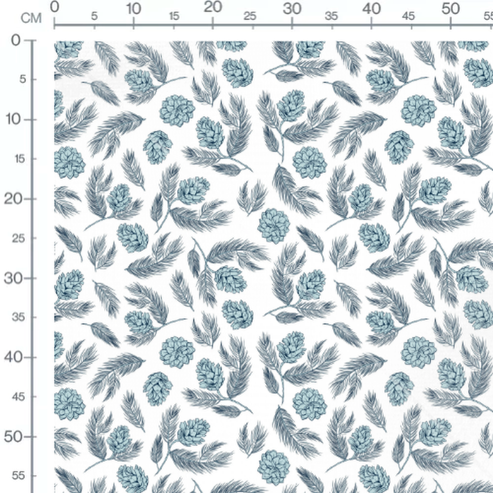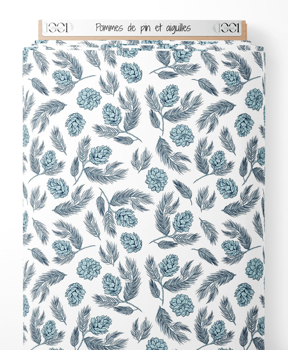 Les pommes de pin sont dessinées en bleu clair. Les aiguilles de pin sont représentées en gris foncé.Les tissus