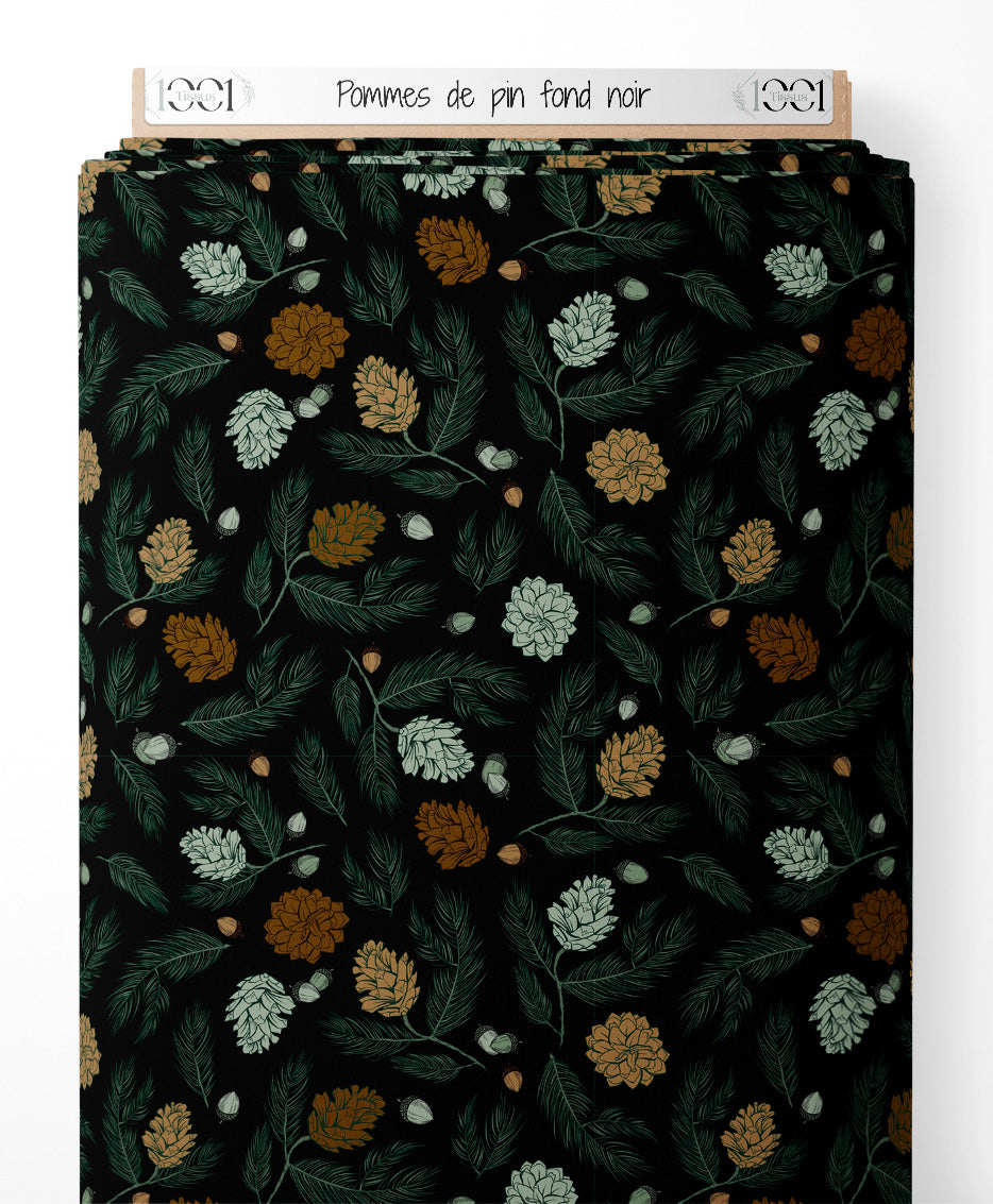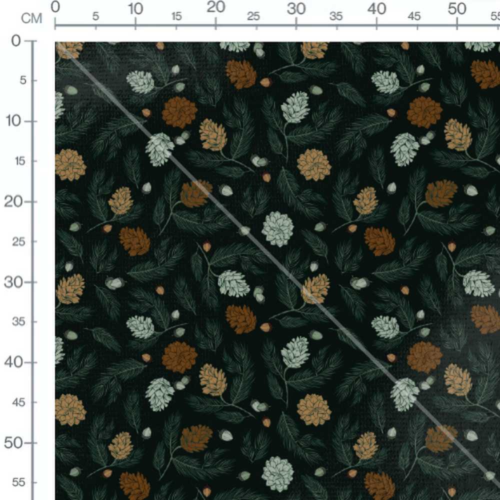 Les pommes de pin sont de différentes teintes de marron et de vert. Les feuilles de pin sont détaillées et d'un vert profond. Des glands gris et marron ajoutent des touches naturelles au motif.Les tissus