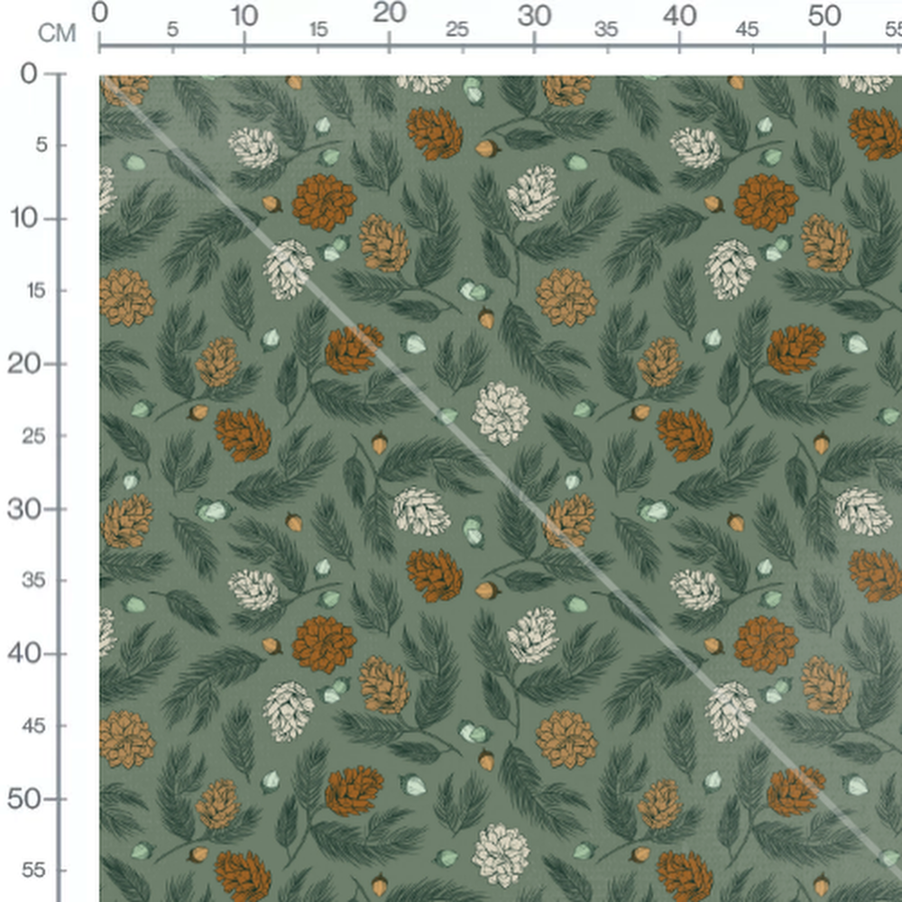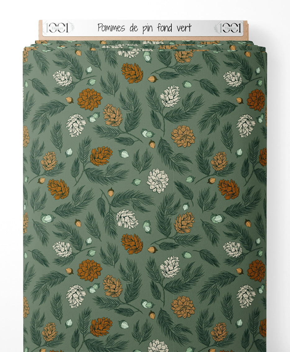 Les pommes de pin sont entourées de feuilles de pin détaillées. Quelques glands ajoutent une touche naturelle au motif. Le fond vert crée une ambiance forestière apaisante.Les tissus