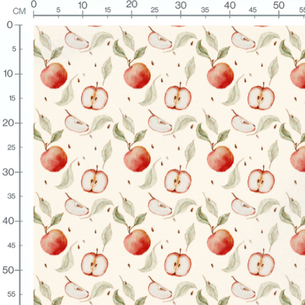 Les pommes sont entières et coupées en tranches. Les feuilles sont délicatement peintes en vert doux. Les graines ajoutent un détail subtil au motif.Les tissus