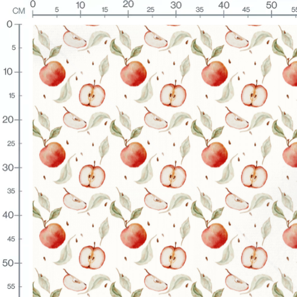 Les pommes rouges entières sont accompagnées de tranches montrant l'intérieur du fruit. Les feuilles vertes ajoutent une touche naturelle, tandis que les petites graines marron complètent le motif.Les tissus