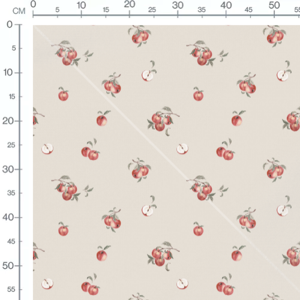 Les pommes sont accompagnées de petites feuilles vertes. Certaines pommes sont entières, d'autres sont coupées en deux.Les tissus