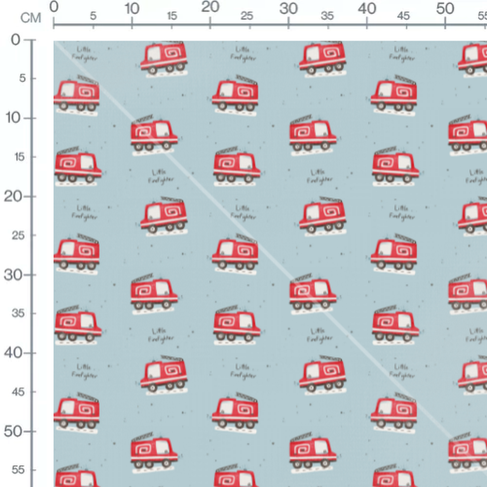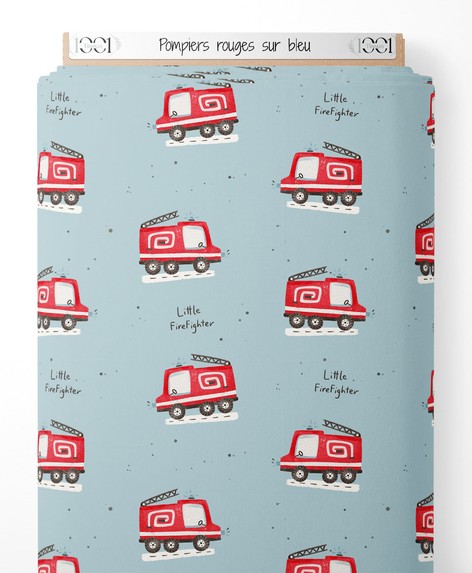 Les camions sont illustrés avec des détails blancs et noirs. Le fond bleu est parsemé de petites taches grises.Les tissus