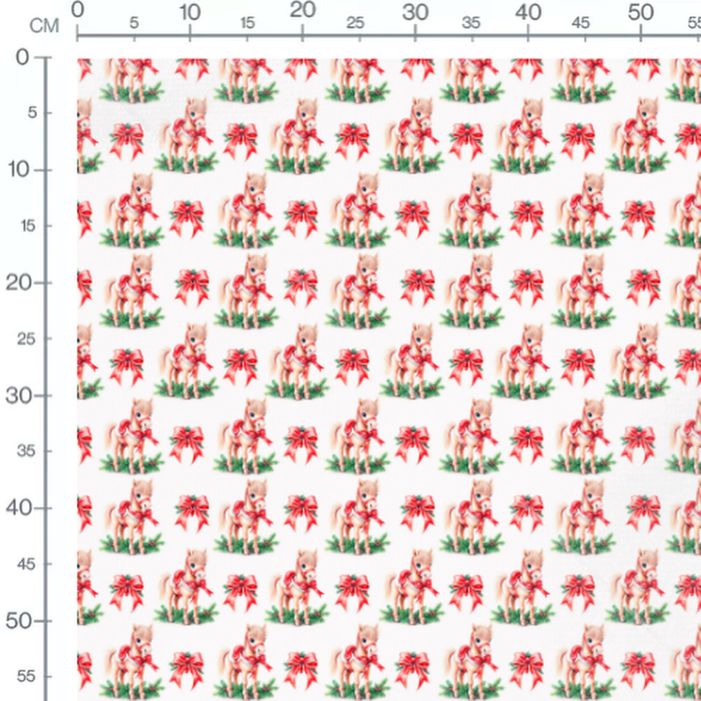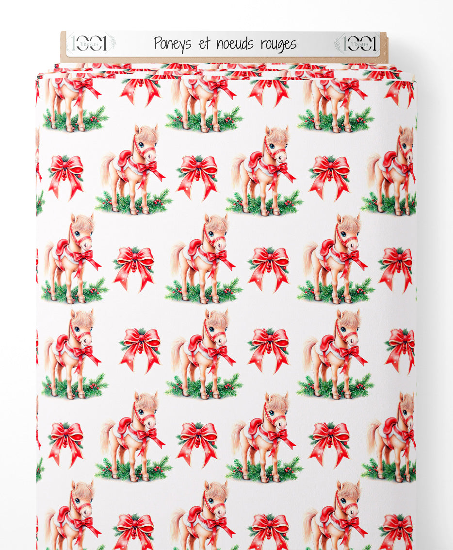 Les poneys portent de grands nœuds rouges autour du cou. Les nœuds rouges sont accompagnés de petites branches de sapin vertes.Les tissus
