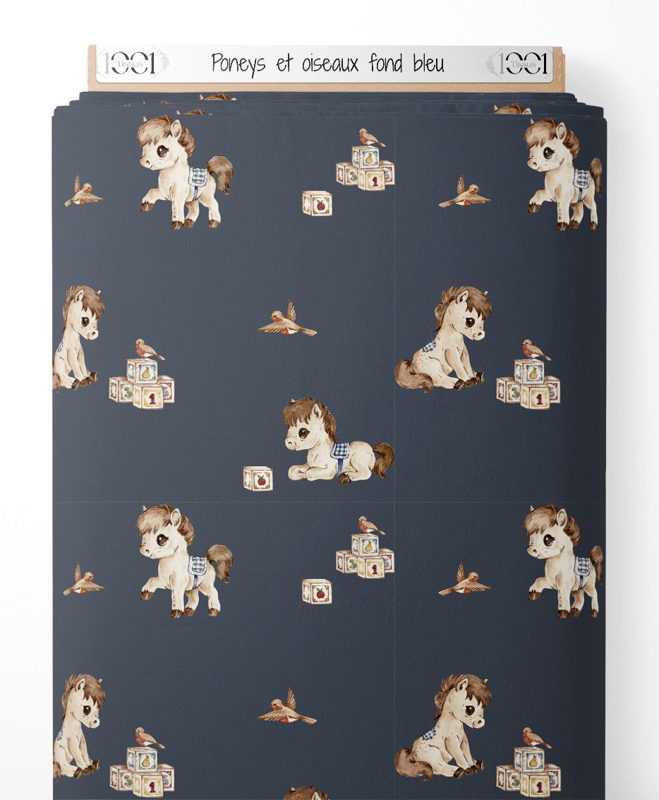 Tissu - Poneys et oiseaux sur fond bleu