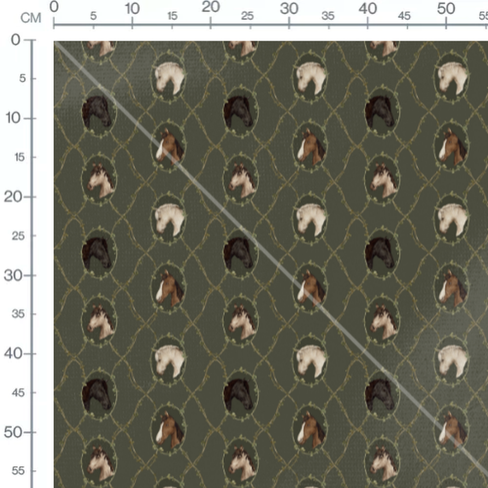 Les chevaux sont représentés dans des tons naturels avec des détails réalistes. Les lianes ajoutent une touche organique au motif. Chaque cheval est encadré dans un ovale délicat.Les tissus