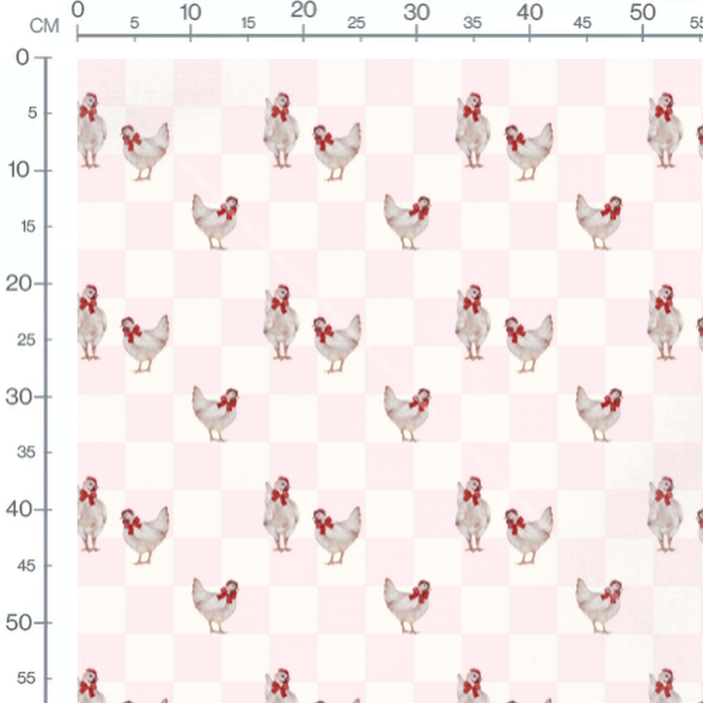 Les poules sont représentées avec un nœud rouge autour du cou. Le fond à carreaux roses et blancs ajoute une touche douce et ludique au motif.Les tissus