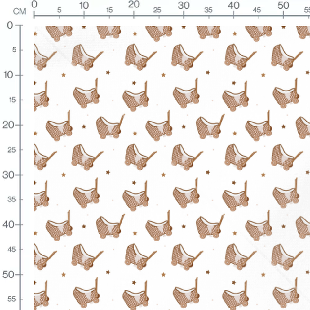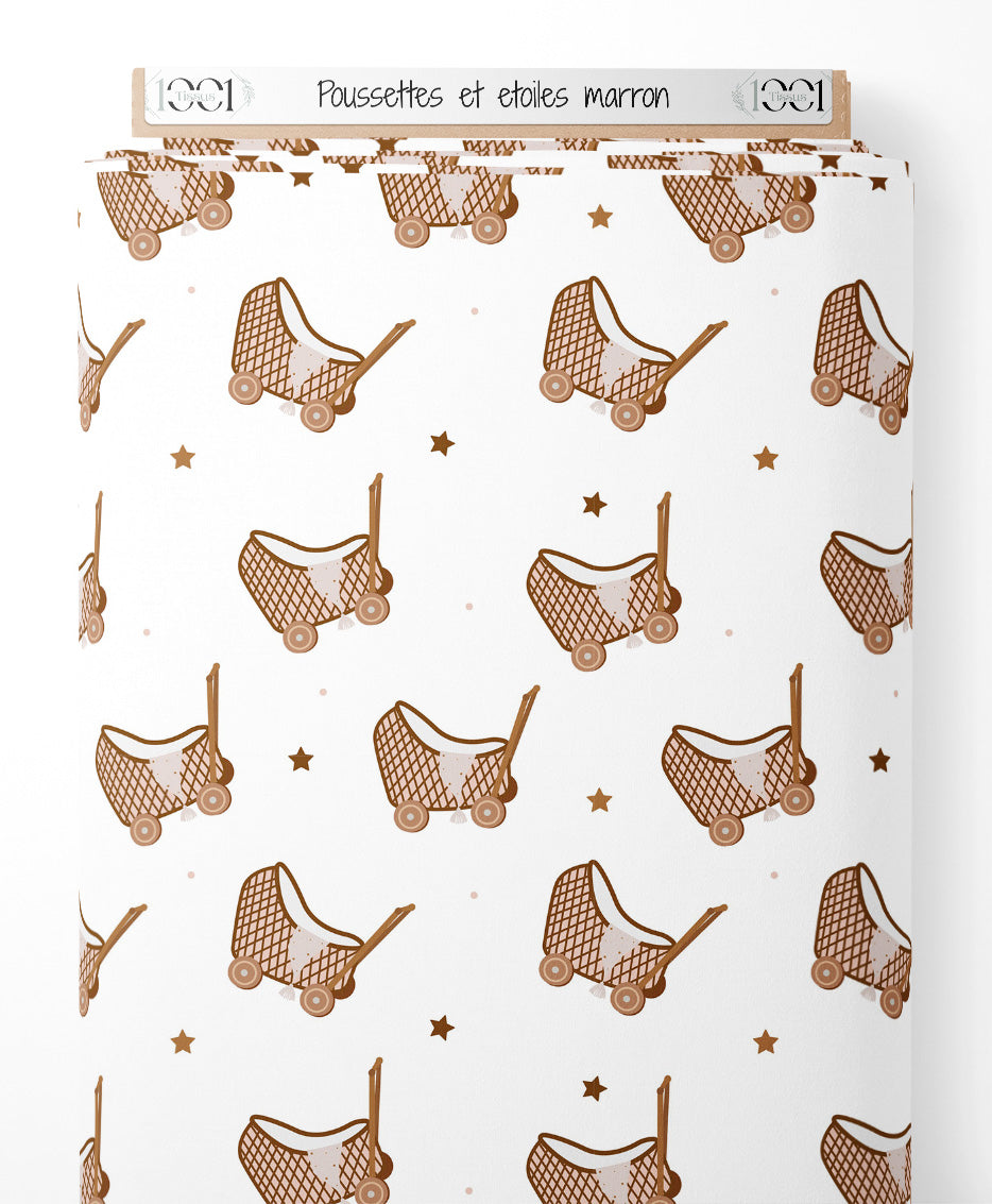 Les poussettes sont dessinées avec des lignes marron et des motifs en treillis. De petites étoiles marron ajoutent un détail ludique au design.Les tissus