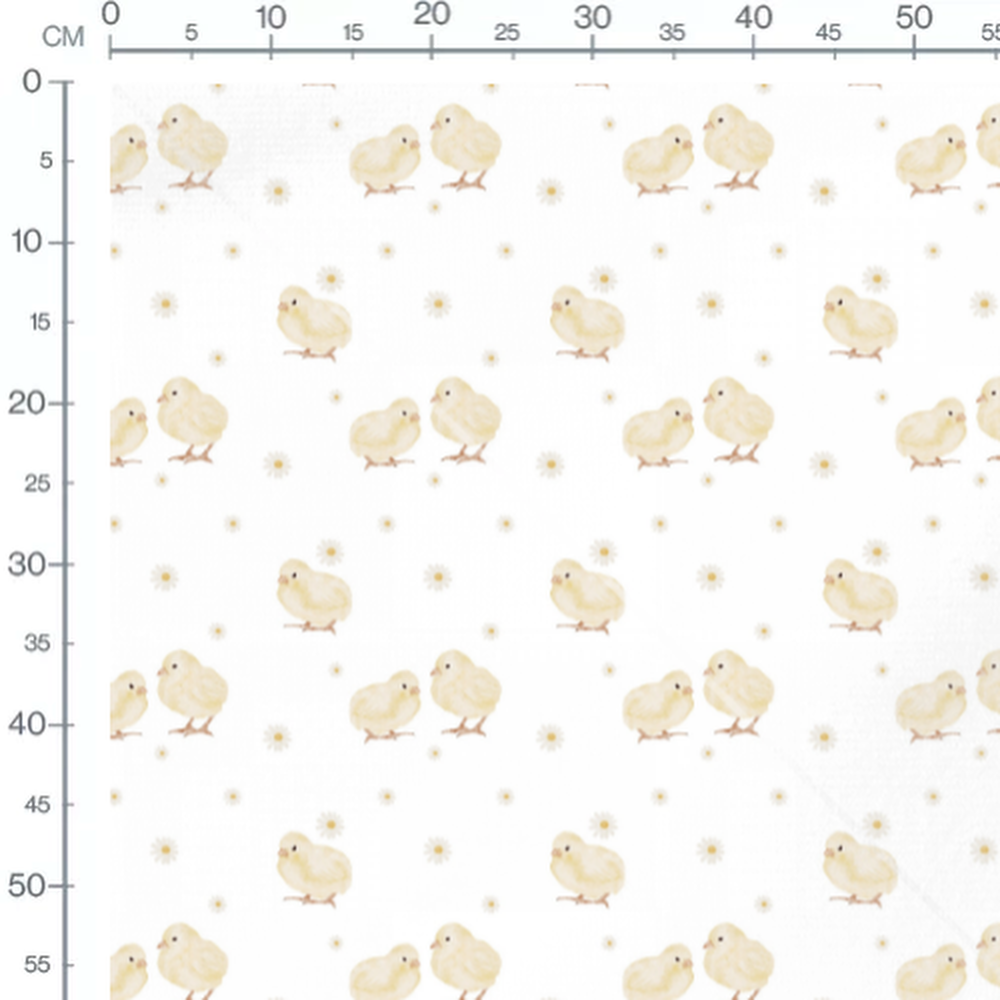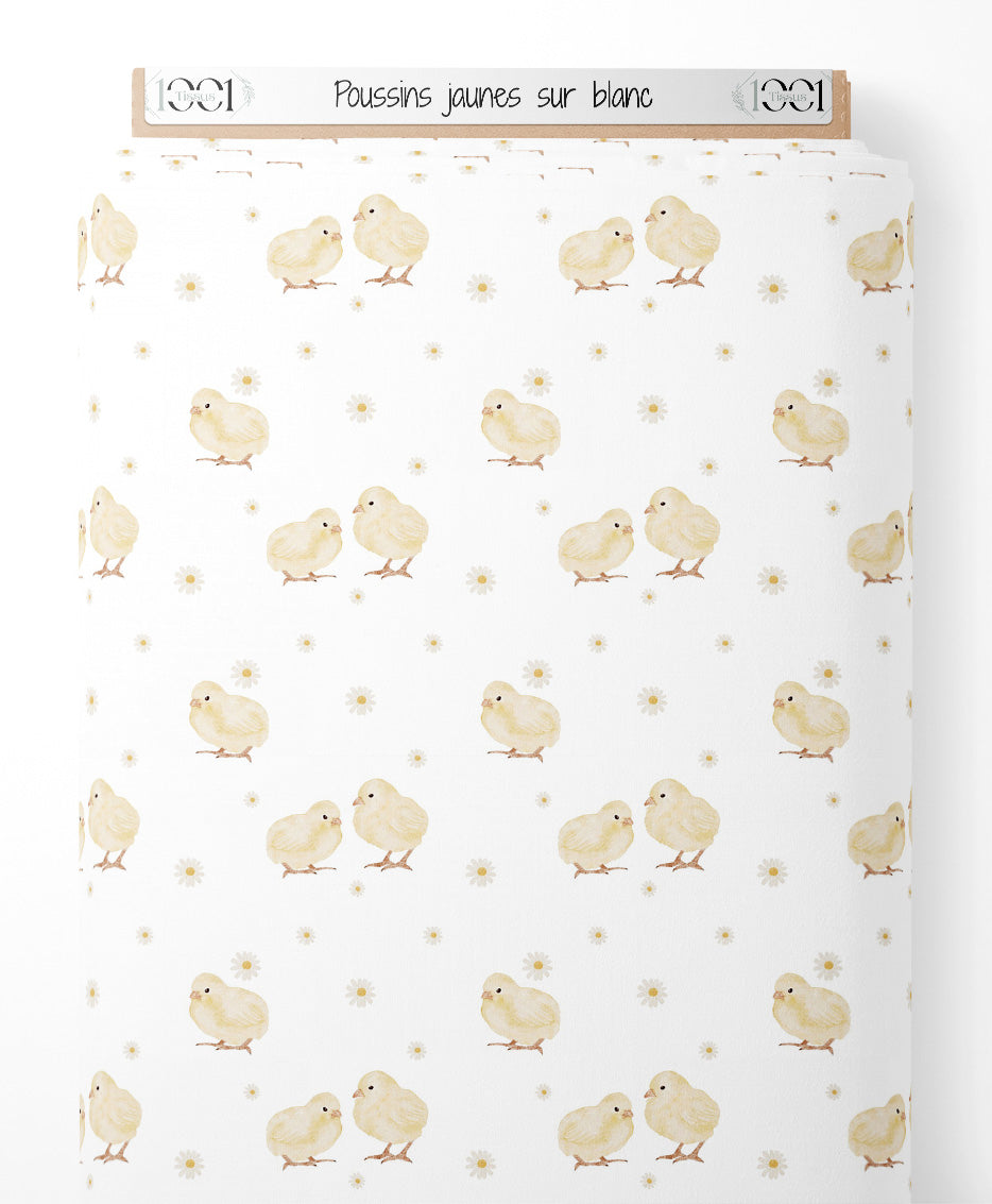 Les poussins sont dessinés dans des tons doux de jaune. Les marguerites ajoutent une touche florale délicate au motif.Les tissus