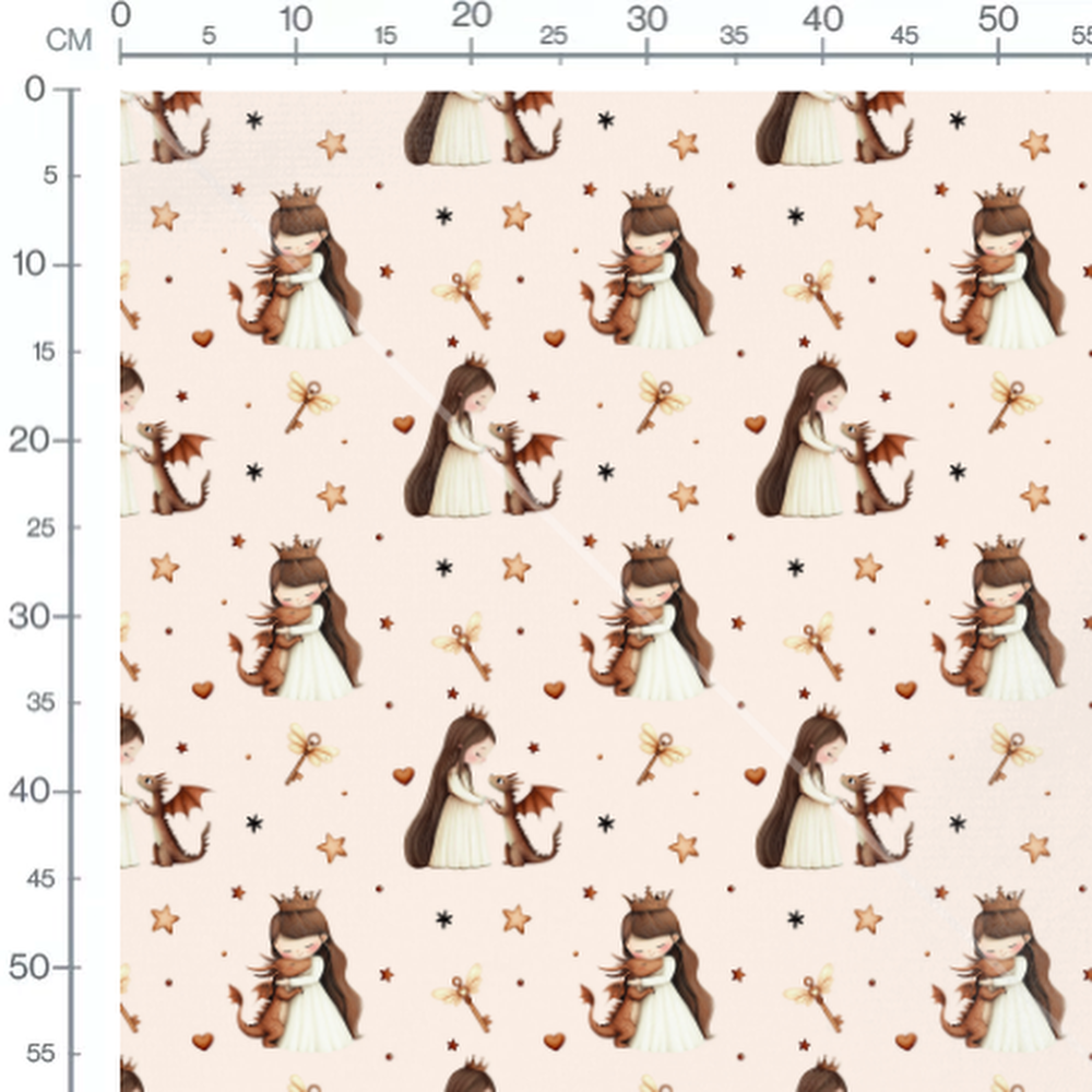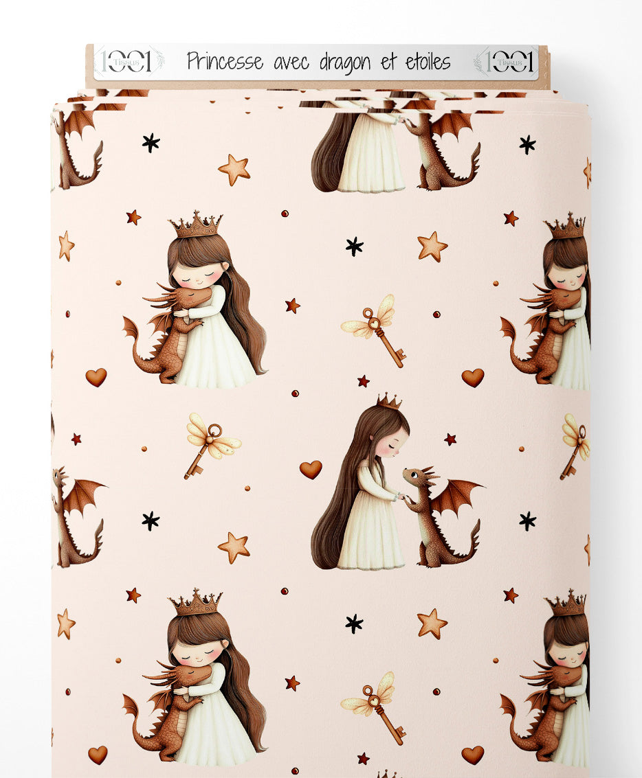 La princesse porte une robe blanche et une couronne. Le dragon est petit et brun avec des ailes. Des étoiles et des cœurs bruns décorent le fond. Des clés dorées avec des ailes ajoutent une touche magique.Les tissus