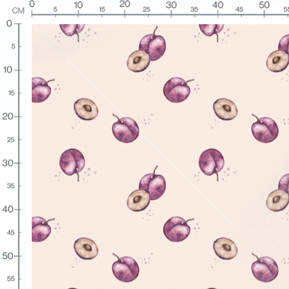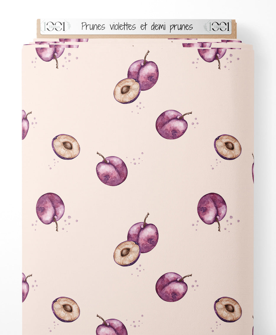 Les prunes sont représentées en entier et en moitiés, montrant le noyau. Les nuances de violet varient légèrement, ajoutant de la profondeur au motif.Les tissus
