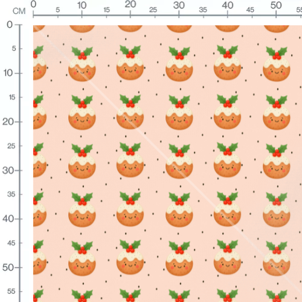 Les puddings ont un glaçage blanc et des feuilles de houx vertes avec des baies rouges. Les visages souriants ajoutent une touche ludique au motif.Les tissus