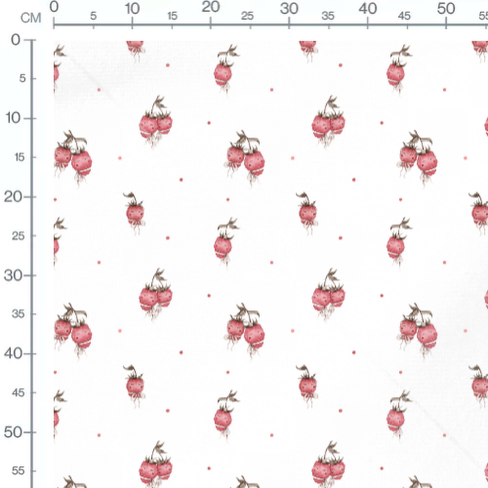 Les radis sont dessinés avec des traits doux et des expressions joyeuses. Chaque radis est accompagné de petites feuilles vertes. Les points rouges ajoutent une touche ludique au motif.Les tissus