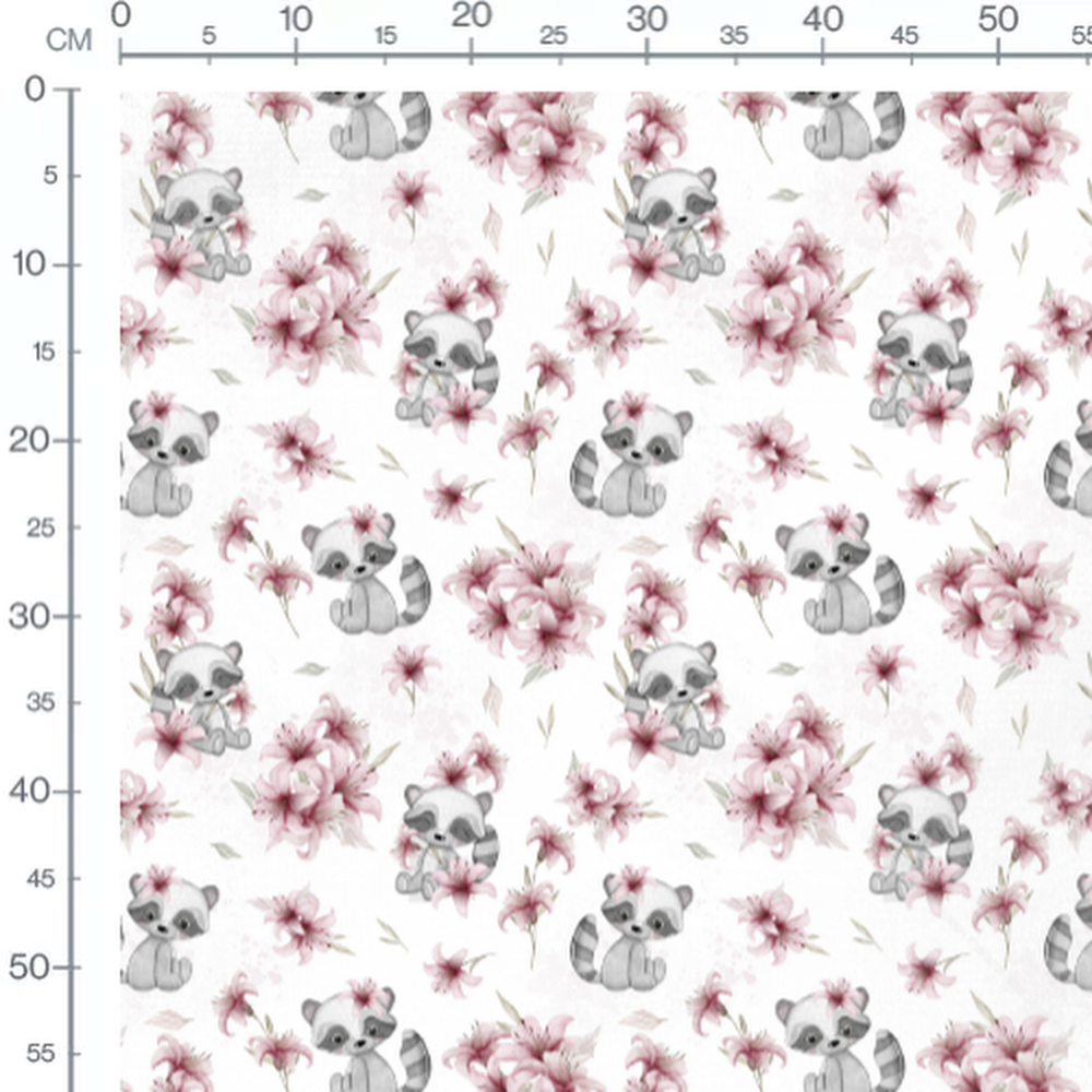 Tissu - Raton laveur et fleurs roses