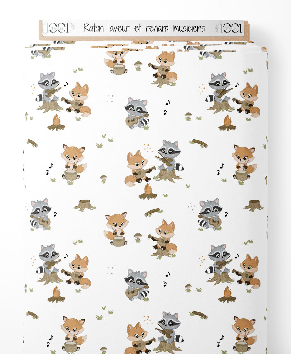 Les ratons laveurs jouent de la guitare tandis que les renards tapent sur des tambours. Des souches d'arbres et des touffes d'herbe complètent le motif.Les tissus