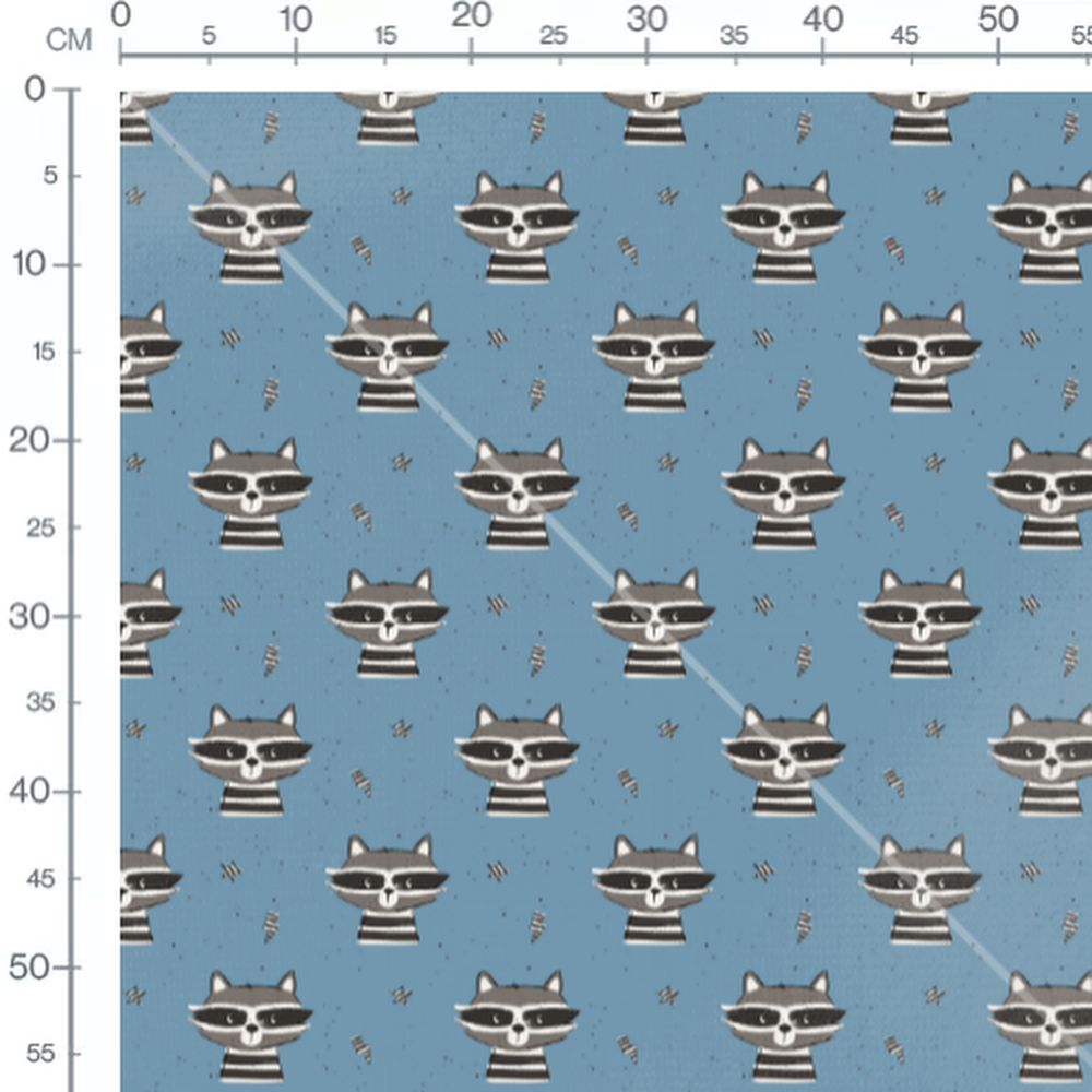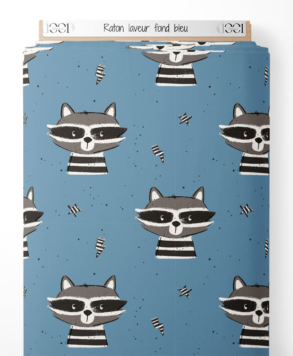 Les ratons laveurs ont des rayures noires et blanches. Le fond bleu est parsemé de petites étoiles et éclairs décoratifs.Les tissus