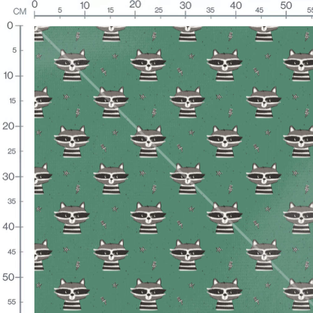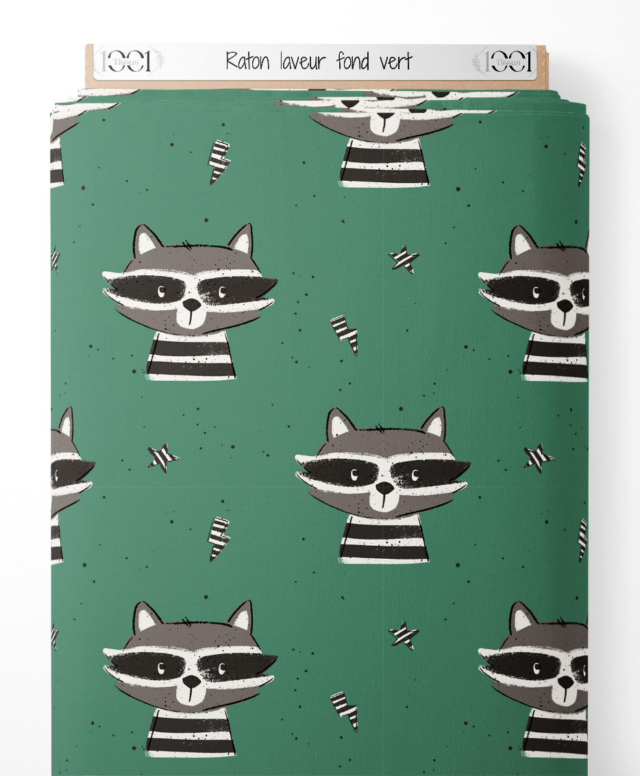 Les ratons laveurs ont des rayures noires et blanches. Le fond vert est parsemé de petites étoiles et éclairs décoratifs.Les tissus