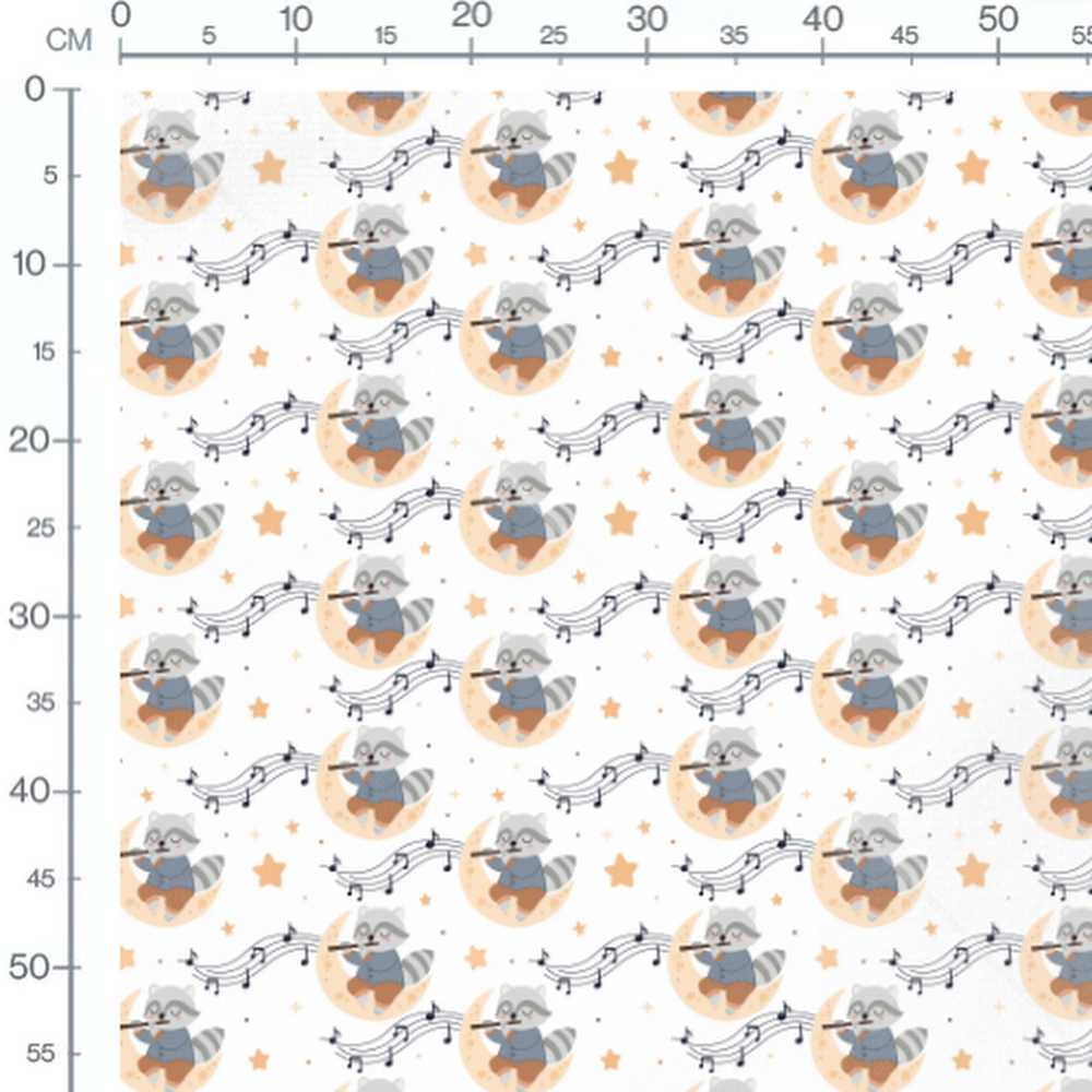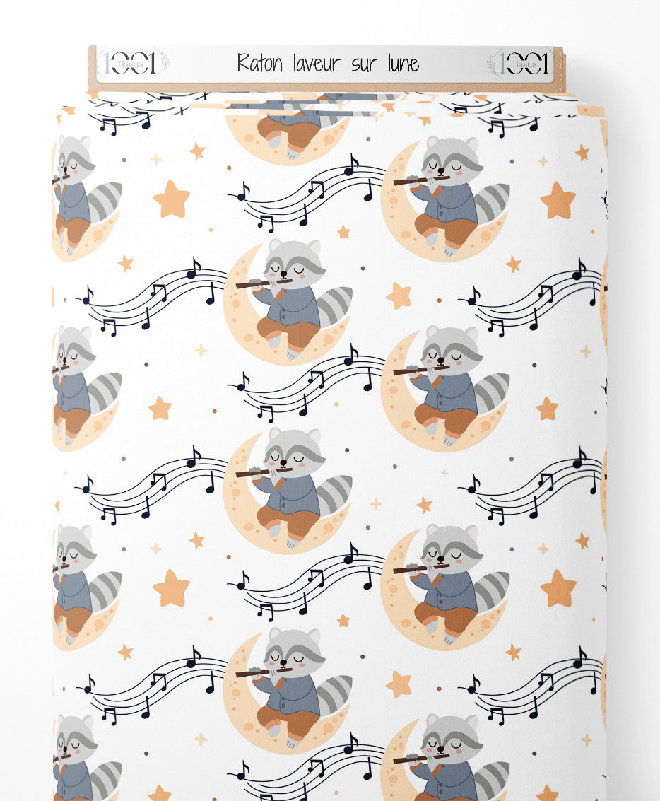 Les ratons laveurs portent des vêtements bleus et marron. Les lunes sont décorées de petits points beige. Les notes de musique noires flottent autour des ratons laveurs.Les tissus