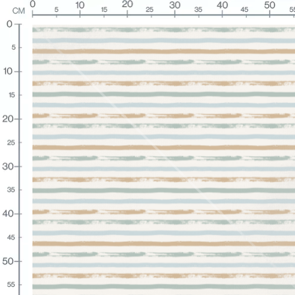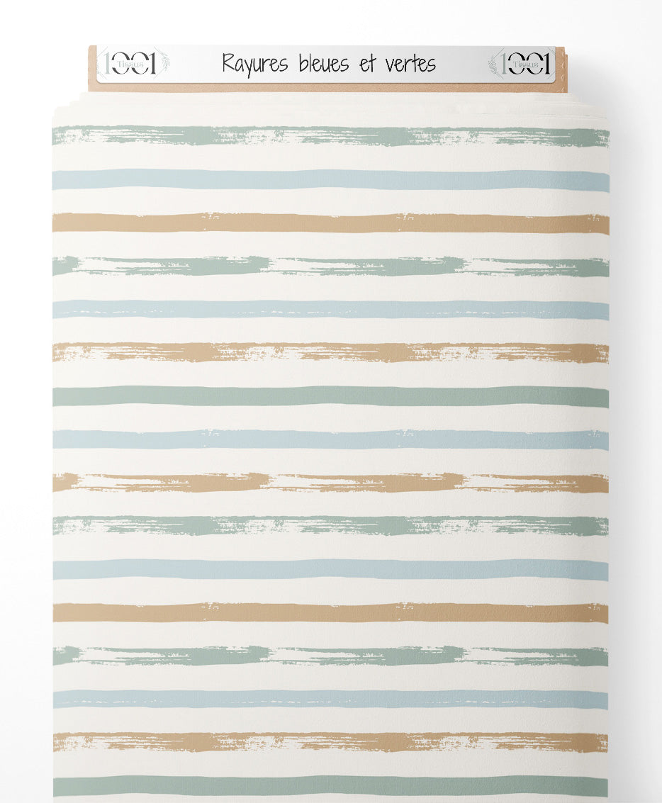 Les rayures sont de différentes largeurs et présentent une texture de peinture. Les couleurs incluent des nuances de bleu, beige et vert clair.Les tissus