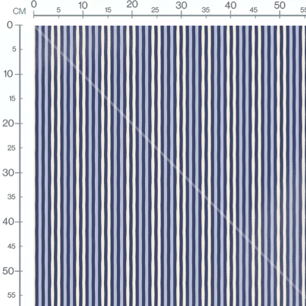 Les rayures varient en largeur et en teinte de bleu. Le motif présente une alternance de rayures bleues foncées et bleues claires. Le fond crème met en valeur les nuances de bleu des rayures.Les tissus